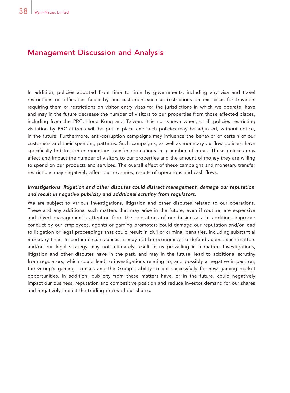 38 Wynn Macau, Limited Management Discussion and Analysis In addition, policies adopted from time to time by governments, including any visa and travel restrictions or difficulties faced by our customers such as restrictions on exit visas for travelers requiring them or restrictions on visitor entry visas for the jurisdictions in which we operate, have and may in the future decrease the number of visitors to our properties from those affected places, including from the PRC, Hong Kong and Taiwan. It is not known when, or if, policies restricting visitation by PRC citizens will be put in place and such policies may be adjusted, without notice, in the future. Furthermore, anti-corruption campaigns may influence the behavior of certain of our customers and their spending patterns. Such campaigns, as well as monetary outflow policies, have specifically led to tighter monetary transfer regulations in a number of areas. These policies may affect and impact the number of visitors to our properties and the amount of money they are willing to spend on our products and services. The overall effect of these campaigns and monetary transfer restrictions may negatively affect our revenues, results of operations and cash flows. Investigations, litigation and other disputes could distract management, damage our reputation and result in negative publicity and additional scrutiny from regulators. We are subject to various investigations, litigation and other disputes related to our operations. These and any additional such matters that may arise in the future, even if routine, are expensive and divert management’s attention from the operations of our businesses. In addition, improper conduct by our employees, agents or gaming promoters could damage our reputation and/or lead to litigation or legal proceedings that could result in civil or criminal penalties, including substantial monetary fines. In certain circumstances, it may not be economical to defend against such matters and/or our legal strategy may not ultimately result in us prevailing in a matter. Investigations, litigation and other disputes have in the past, and may in the future, lead to additional scrutiny from regulators, which could lead to investigations relating to, and possibly a negative impact on, the Group’s gaming licenses and the Group’s ability to bid successfully for new gaming market opportunities. In addition, publicity from these matters have, or in the future, could negatively impact our business, reputation and competitive position and reduce investor demand for our shares and negatively impact the trading prices of our shares.