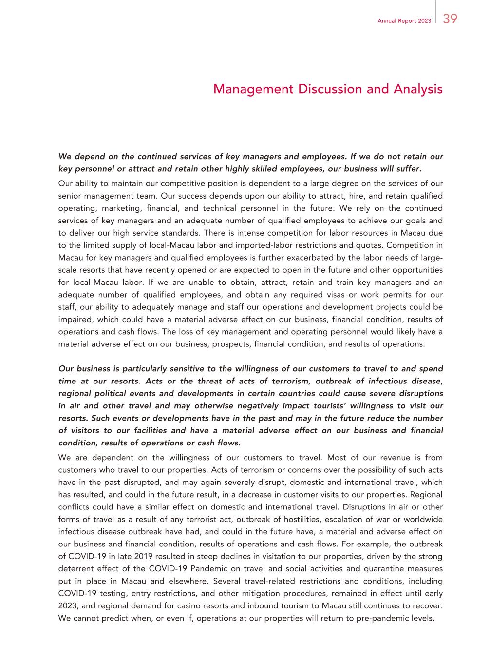 39Annual Report 2023 Management Discussion and Analysis We depend on the continued services of key managers and employees. If we do not retain our key personnel or attract and retain other highly skilled employees, our business will suffer. Our ability to maintain our competitive position is dependent to a large degree on the services of our senior management team. Our success depends upon our ability to attract, hire, and retain qualified operating, marketing, financial, and technical personnel in the future. We rely on the continued services of key managers and an adequate number of qualified employees to achieve our goals and to deliver our high service standards. There is intense competition for labor resources in Macau due to the limited supply of local-Macau labor and imported-labor restrictions and quotas. Competition in Macau for key managers and qualified employees is further exacerbated by the labor needs of large- scale resorts that have recently opened or are expected to open in the future and other opportunities for local-Macau labor. If we are unable to obtain, attract, retain and train key managers and an adequate number of qualified employees, and obtain any required visas or work permits for our staff, our ability to adequately manage and staff our operations and development projects could be impaired, which could have a material adverse effect on our business, financial condition, results of operations and cash flows. The loss of key management and operating personnel would likely have a material adverse effect on our business, prospects, financial condition, and results of operations. Our business is particularly sensitive to the willingness of our customers to travel to and spend time at our resorts. Acts or the threat of acts of terrorism, outbreak of infectious disease, regional political events and developments in certain countries could cause severe disruptions in air and other travel and may otherwise negatively impact tourists’ willingness to visit our resorts. Such events or developments have in the past and may in the future reduce the number of visitors to our facilities and have a material adverse effect on our business and financial condition, results of operations or cash flows. We are dependent on the willingness of our customers to travel. Most of our revenue is from customers who travel to our properties. Acts of terrorism or concerns over the possibility of such acts have in the past disrupted, and may again severely disrupt, domestic and international travel, which has resulted, and could in the future result, in a decrease in customer visits to our properties. Regional conflicts could have a similar effect on domestic and international travel. Disruptions in air or other forms of travel as a result of any terrorist act, outbreak of hostilities, escalation of war or worldwide infectious disease outbreak have had, and could in the future have, a material and adverse effect on our business and financial condition, results of operations and cash flows. For example, the outbreak of COVID-19 in late 2019 resulted in steep declines in visitation to our properties, driven by the strong deterrent effect of the COVID-19 Pandemic on travel and social activities and quarantine measures put in place in Macau and elsewhere. Several travel-related restrictions and conditions, including COVID-19 testing, entry restrictions, and other mitigation procedures, remained in effect until early 2023, and regional demand for casino resorts and inbound tourism to Macau still continues to recover. We cannot predict when, or even if, operations at our properties will return to pre-pandemic levels.