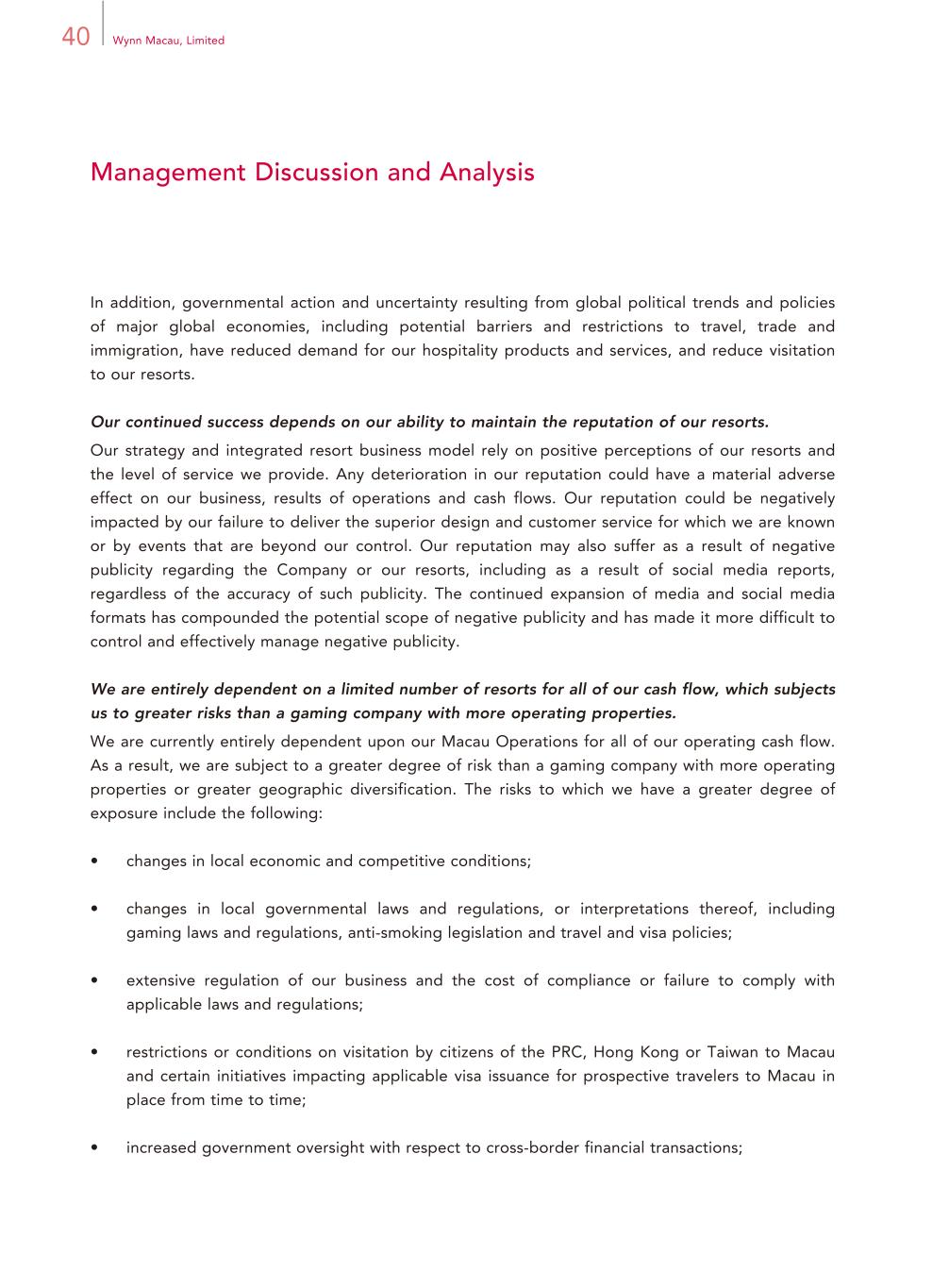 40 Wynn Macau, Limited Management Discussion and Analysis In addition, governmental action and uncertainty resulting from global political trends and policies of major global economies, including potential barriers and restrictions to travel, trade and immigration, have reduced demand for our hospitality products and services, and reduce visitation to our resorts. Our continued success depends on our ability to maintain the reputation of our resorts. Our strategy and integrated resort business model rely on positive perceptions of our resorts and the level of service we provide. Any deterioration in our reputation could have a material adverse effect on our business, results of operations and cash flows. Our reputation could be negatively impacted by our failure to deliver the superior design and customer service for which we are known or by events that are beyond our control. Our reputation may also suffer as a result of negative publicity regarding the Company or our resorts, including as a result of social media reports, regardless of the accuracy of such publicity. The continued expansion of media and social media formats has compounded the potential scope of negative publicity and has made it more difficult to control and effectively manage negative publicity. We are entirely dependent on a limited number of resorts for all of our cash flow, which subjects us to greater risks than a gaming company with more operating properties. We are currently entirely dependent upon our Macau Operations for all of our operating cash flow. As a result, we are subject to a greater degree of risk than a gaming company with more operating properties or greater geographic diversification. The risks to which we have a greater degree of exposure include the following: • changes in local economic and competitive conditions; • changes in local governmental laws and regulations, or interpretations thereof, including gaming laws and regulations, anti-smoking legislation and travel and visa policies; • extensive regulation of our business and the cost of compliance or failure to comply with applicable laws and regulations; • restrictions or conditions on visitation by citizens of the PRC, Hong Kong or Taiwan to Macau and certain initiatives impacting applicable visa issuance for prospective travelers to Macau in place from time to time; • increased government oversight with respect to cross-border financial transactions;