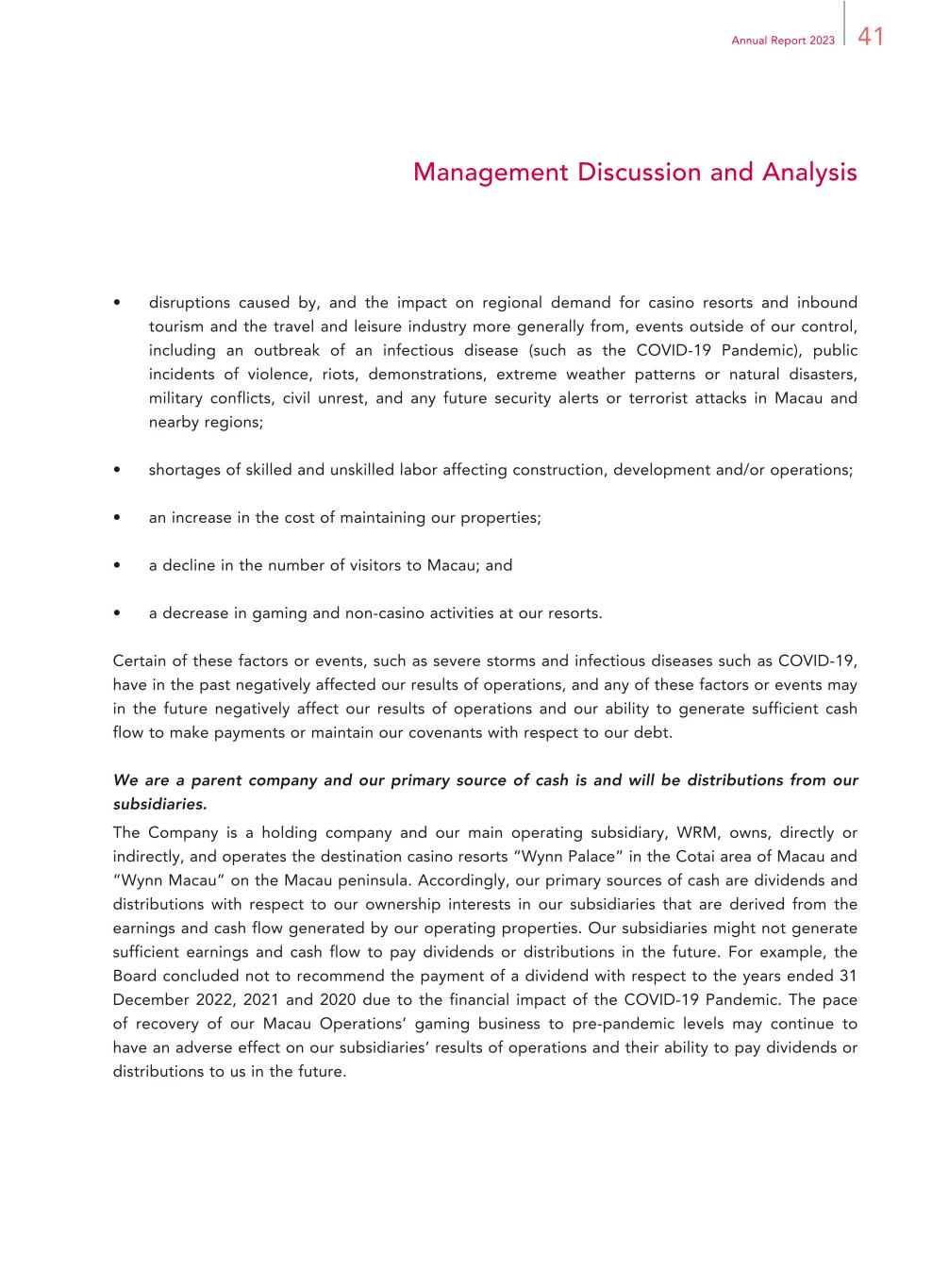 41Annual Report 2023 Management Discussion and Analysis • disruptions caused by, and the impact on regional demand for casino resorts and inbound tourism and the travel and leisure industry more generally from, events outside of our control, including an outbreak of an infectious disease (such as the COVID-19 Pandemic), public incidents of violence, riots, demonstrations, extreme weather patterns or natural disasters, military conflicts, civil unrest, and any future security alerts or terrorist attacks in Macau and nearby regions; • shortages of skilled and unskilled labor affecting construction, development and/or operations; • an increase in the cost of maintaining our properties; • a decline in the number of visitors to Macau; and • a decrease in gaming and non-casino activities at our resorts. Certain of these factors or events, such as severe storms and infectious diseases such as COVID-19, have in the past negatively affected our results of operations, and any of these factors or events may in the future negatively affect our results of operations and our ability to generate sufficient cash flow to make payments or maintain our covenants with respect to our debt. We are a parent company and our primary source of cash is and will be distributions from our subsidiaries. The Company is a holding company and our main operating subsidiary, WRM, owns, directly or indirectly, and operates the destination casino resorts “Wynn Palace” in the Cotai area of Macau and “Wynn Macau” on the Macau peninsula. Accordingly, our primary sources of cash are dividends and distributions with respect to our ownership interests in our subsidiaries that are derived from the earnings and cash flow generated by our operating properties. Our subsidiaries might not generate sufficient earnings and cash flow to pay dividends or distributions in the future. For example, the Board concluded not to recommend the payment of a dividend with respect to the years ended 31 December 2022, 2021 and 2020 due to the financial impact of the COVID-19 Pandemic. The pace of recovery of our Macau Operations’ gaming business to pre-pandemic levels may continue to have an adverse effect on our subsidiaries’ results of operations and their ability to pay dividends or distributions to us in the future.