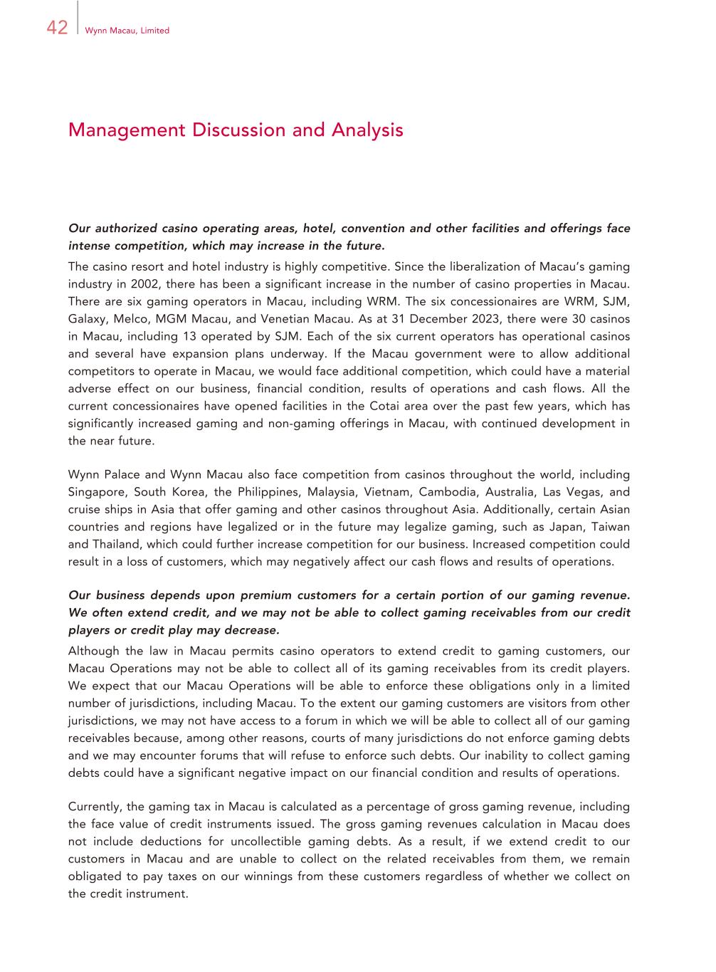 42 Wynn Macau, Limited Management Discussion and Analysis Our authorized casino operating areas, hotel, convention and other facilities and offerings face intense competition, which may increase in the future. The casino resort and hotel industry is highly competitive. Since the liberalization of Macau’s gaming industry in 2002, there has been a significant increase in the number of casino properties in Macau. There are six gaming operators in Macau, including WRM. The six concessionaires are WRM, SJM, Galaxy, Melco, MGM Macau, and Venetian Macau. As at 31 December 2023, there were 30 casinos in Macau, including 13 operated by SJM. Each of the six current operators has operational casinos and several have expansion plans underway. If the Macau government were to allow additional competitors to operate in Macau, we would face additional competition, which could have a material adverse effect on our business, financial condition, results of operations and cash flows. All the current concessionaires have opened facilities in the Cotai area over the past few years, which has significantly increased gaming and non-gaming offerings in Macau, with continued development in the near future. Wynn Palace and Wynn Macau also face competition from casinos throughout the world, including Singapore, South Korea, the Philippines, Malaysia, Vietnam, Cambodia, Australia, Las Vegas, and cruise ships in Asia that offer gaming and other casinos throughout Asia. Additionally, certain Asian countries and regions have legalized or in the future may legalize gaming, such as Japan, Taiwan and Thailand, which could further increase competition for our business. Increased competition could result in a loss of customers, which may negatively affect our cash flows and results of operations. Our business depends upon premium customers for a certain portion of our gaming revenue. We often extend credit, and we may not be able to collect gaming receivables from our credit players or credit play may decrease. Although the law in Macau permits casino operators to extend credit to gaming customers, our Macau Operations may not be able to collect all of its gaming receivables from its credit players. We expect that our Macau Operations will be able to enforce these obligations only in a limited number of jurisdictions, including Macau. To the extent our gaming customers are visitors from other jurisdictions, we may not have access to a forum in which we will be able to collect all of our gaming receivables because, among other reasons, courts of many jurisdictions do not enforce gaming debts and we may encounter forums that will refuse to enforce such debts. Our inability to collect gaming debts could have a significant negative impact on our financial condition and results of operations. Currently, the gaming tax in Macau is calculated as a percentage of gross gaming revenue, including the face value of credit instruments issued. The gross gaming revenues calculation in Macau does not include deductions for uncollectible gaming debts. As a result, if we extend credit to our customers in Macau and are unable to collect on the related receivables from them, we remain obligated to pay taxes on our winnings from these customers regardless of whether we collect on the credit instrument.