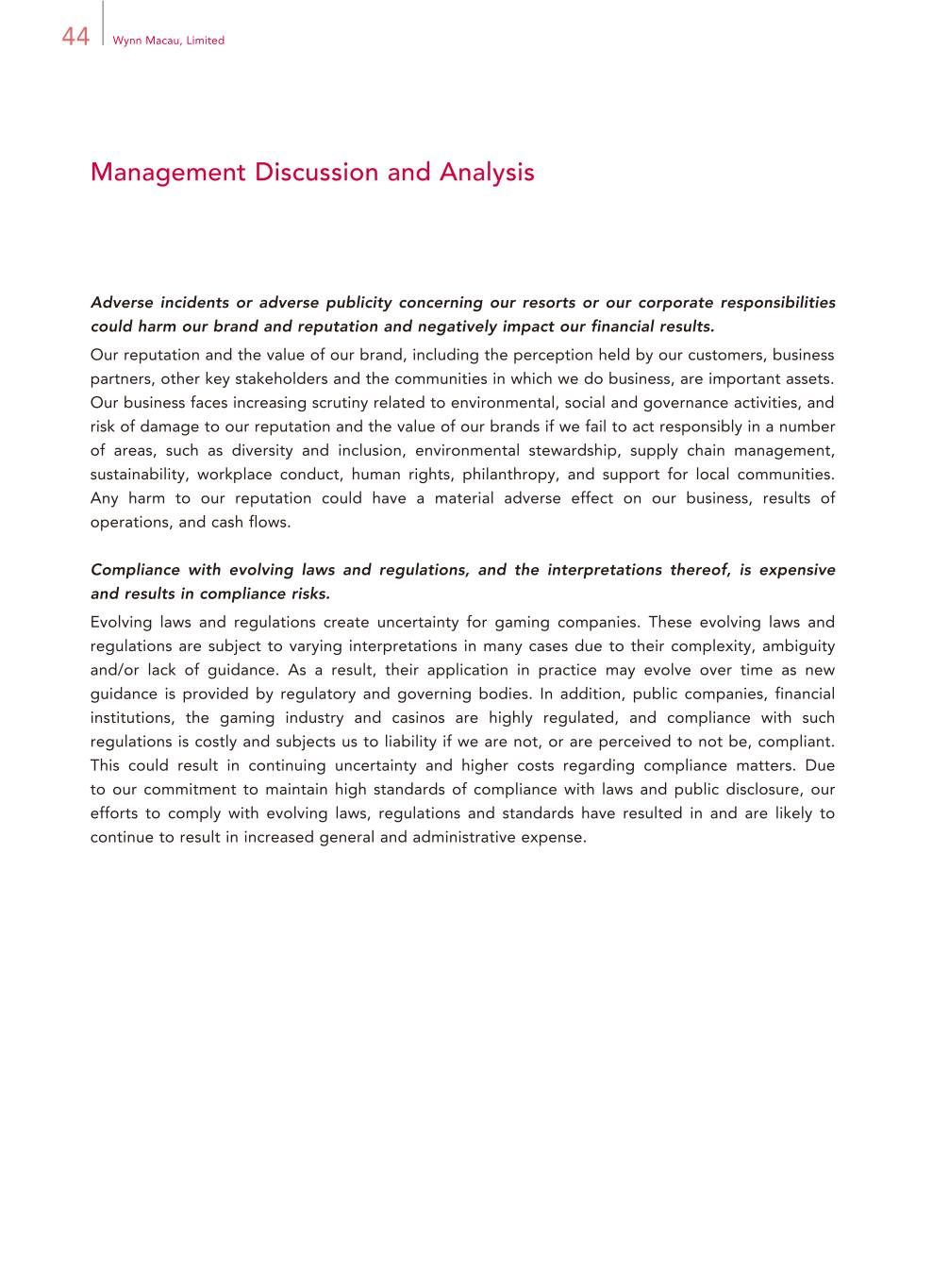 44 Wynn Macau, Limited Management Discussion and Analysis Adverse incidents or adverse publicity concerning our resorts or our corporate responsibilities could harm our brand and reputation and negatively impact our financial results. Our reputation and the value of our brand, including the perception held by our customers, business partners, other key stakeholders and the communities in which we do business, are important assets. Our business faces increasing scrutiny related to environmental, social and governance activities, and risk of damage to our reputation and the value of our brands if we fail to act responsibly in a number of areas, such as diversity and inclusion, environmental stewardship, supply chain management, sustainability, workplace conduct, human rights, philanthropy, and support for local communities. Any harm to our reputation could have a material adverse effect on our business, results of operations, and cash flows. Compliance with evolving laws and regulations, and the interpretations thereof, is expensive and results in compliance risks. Evolving laws and regulations create uncertainty for gaming companies. These evolving laws and regulations are subject to varying interpretations in many cases due to their complexity, ambiguity and/or lack of guidance. As a result, their application in practice may evolve over time as new guidance is provided by regulatory and governing bodies. In addition, public companies, financial institutions, the gaming industry and casinos are highly regulated, and compliance with such regulations is costly and subjects us to liability if we are not, or are perceived to not be, compliant. This could result in continuing uncertainty and higher costs regarding compliance matters. Due to our commitment to maintain high standards of compliance with laws and public disclosure, our efforts to comply with evolving laws, regulations and standards have resulted in and are likely to continue to result in increased general and administrative expense.