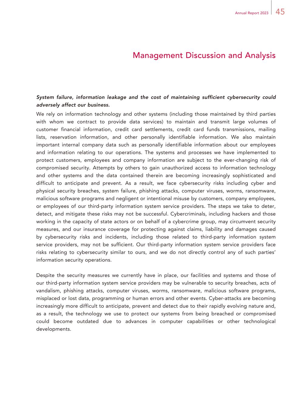 45Annual Report 2023 Management Discussion and Analysis System failure, information leakage and the cost of maintaining sufficient cybersecurity could adversely affect our business. We rely on information technology and other systems (including those maintained by third parties with whom we contract to provide data services) to maintain and transmit large volumes of customer financial information, credit card settlements, credit card funds transmissions, mailing lists, reservation information, and other personally identifiable information. We also maintain important internal company data such as personally identifiable information about our employees and information relating to our operations. The systems and processes we have implemented to protect customers, employees and company information are subject to the ever-changing risk of compromised security. Attempts by others to gain unauthorized access to information technology and other systems and the data contained therein are becoming increasingly sophisticated and difficult to anticipate and prevent. As a result, we face cybersecurity risks including cyber and physical security breaches, system failure, phishing attacks, computer viruses, worms, ransomware, malicious software programs and negligent or intentional misuse by customers, company employees, or employees of our third-party information system service providers. The steps we take to deter, detect, and mitigate these risks may not be successful. Cybercriminals, including hackers and those working in the capacity of state actors or on behalf of a cybercrime group, may circumvent security measures, and our insurance coverage for protecting against claims, liability and damages caused by cybersecurity risks and incidents, including those related to third-party information system service providers, may not be sufficient. Our third-party information system service providers face risks relating to cybersecurity similar to ours, and we do not directly control any of such parties’ information security operations. Despite the security measures we currently have in place, our facilities and systems and those of our third-party information system service providers may be vulnerable to security breaches, acts of vandalism, phishing attacks, computer viruses, worms, ransomware, malicious software programs, misplaced or lost data, programming or human errors and other events. Cyber-attacks are becoming increasingly more difficult to anticipate, prevent and detect due to their rapidly evolving nature and, as a result, the technology we use to protect our systems from being breached or compromised could become outdated due to advances in computer capabilities or other technological developments.