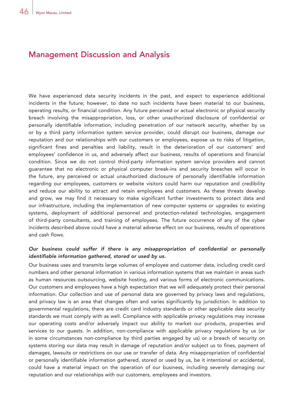 46 Wynn Macau, Limited Management Discussion and Analysis We have experienced data security incidents in the past, and expect to experience additional incidents in the future; however, to date no such incidents have been material to our business, operating results, or financial condition. Any future perceived or actual electronic or physical security breach involving the misappropriation, loss, or other unauthorized disclosure of confidential or personally identifiable information, including penetration of our network security, whether by us or by a third party information system service provider, could disrupt our business, damage our reputation and our relationships with our customers or employees, expose us to risks of litigation, significant fines and penalties and liability, result in the deterioration of our customers’ and employees’ confidence in us, and adversely affect our business, results of operations and financial condition. Since we do not control third-party information system service providers and cannot guarantee that no electronic or physical computer break-ins and security breaches will occur in the future, any perceived or actual unauthorized disclosure of personally identifiable information regarding our employees, customers or website visitors could harm our reputation and credibility and reduce our ability to attract and retain employees and customers. As these threats develop and grow, we may find it necessary to make significant further investments to protect data and our infrastructure, including the implementation of new computer systems or upgrades to existing systems, deployment of additional personnel and protection-related technologies, engagement of third-party consultants, and training of employees. The future occurrence of any of the cyber incidents described above could have a material adverse effect on our business, results of operations and cash flows. Our business could suffer if there is any misappropriation of confidential or personally identifiable information gathered, stored or used by us. Our business uses and transmits large volumes of employee and customer data, including credit card numbers and other personal information in various information systems that we maintain in areas such as human resources outsourcing, website hosting, and various forms of electronic communications. Our customers and employees have a high expectation that we will adequately protect their personal information. Our collection and use of personal data are governed by privacy laws and regulations, and privacy law is an area that changes often and varies significantly by jurisdiction. In addition to governmental regulations, there are credit card industry standards or other applicable data security standards we must comply with as well. Compliance with applicable privacy regulations may increase our operating costs and/or adversely impact our ability to market our products, properties and services to our guests. In addition, non-compliance with applicable privacy regulations by us (or in some circumstances non-compliance by third parties engaged by us) or a breach of security on systems storing our data may result in damage of reputation and/or subject us to fines, payment of damages, lawsuits or restrictions on our use or transfer of data. Any misappropriation of confidential or personally identifiable information gathered, stored or used by us, be it intentional or accidental, could have a material impact on the operation of our business, including severely damaging our reputation and our relationships with our customers, employees and investors.