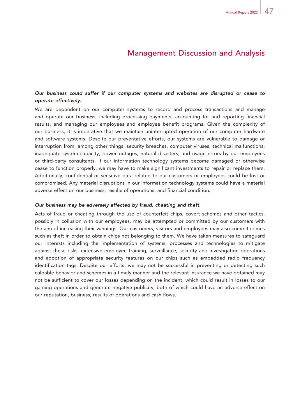 47Annual Report 2023 Management Discussion and Analysis Our business could suffer if our computer systems and websites are disrupted or cease to operate effectively. We are dependent on our computer systems to record and process transactions and manage and operate our business, including processing payments, accounting for and reporting financial results, and managing our employees and employee benefit programs. Given the complexity of our business, it is imperative that we maintain uninterrupted operation of our computer hardware and software systems. Despite our preventative efforts, our systems are vulnerable to damage or interruption from, among other things, security breaches, computer viruses, technical malfunctions, inadequate system capacity, power outages, natural disasters, and usage errors by our employees or third-party consultants. If our information technology systems become damaged or otherwise cease to function properly, we may have to make significant investments to repair or replace them. Additionally, confidential or sensitive data related to our customers or employees could be lost or compromised. Any material disruptions in our information technology systems could have a material adverse effect on our business, results of operations, and financial condition. Our business may be adversely affected by fraud, cheating and theft. Acts of fraud or cheating through the use of counterfeit chips, covert schemes and other tactics, possibly in collusion with our employees, may be attempted or committed by our customers with the aim of increasing their winnings. Our customers, visitors and employees may also commit crimes such as theft in order to obtain chips not belonging to them. We have taken measures to safeguard our interests including the implementation of systems, processes and technologies to mitigate against these risks, extensive employee training, surveillance, security and investigation operations and adoption of appropriate security features on our chips such as embedded radio frequency identification tags. Despite our efforts, we may not be successful in preventing or detecting such culpable behavior and schemes in a timely manner and the relevant insurance we have obtained may not be sufficient to cover our losses depending on the incident, which could result in losses to our gaming operations and generate negative publicity, both of which could have an adverse effect on our reputation, business, results of operations and cash flows.