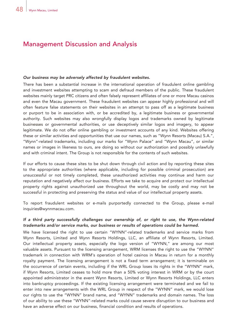 48 Wynn Macau, Limited Management Discussion and Analysis Our business may be adversely affected by fraudulent websites. There has been a substantial increase in the international operation of fraudulent online gambling and investment websites attempting to scam and defraud members of the public. These fraudulent websites mainly target PRC citizens and often falsely represent affiliates of one or more Macau casinos and even the Macau government. These fraudulent websites can appear highly professional and will often feature false statements on their websites in an attempt to pass off as a legitimate business or purport to be in association with, or be accredited by, a legitimate business or governmental authority. Such websites may also wrongfully display logos and trademarks owned by legitimate businesses or governmental authorities, or use deceptively similar logos and imagery, to appear legitimate. We do not offer online gambling or investment accounts of any kind. Websites offering these or similar activities and opportunities that use our names, such as “Wynn Resorts (Macau) S.A.”, “Wynn”-related trademarks, including our marks for “Wynn Palace” and “Wynn Macau”, or similar names or images in likeness to ours, are doing so without our authorization and possibly unlawfully and with criminal intent. The Group is not responsible for the contents of such websites. If our efforts to cause these sites to be shut down through civil action and by reporting these sites to the appropriate authorities (where applicable, including for possible criminal prosecution) are unsuccessful or not timely completed, these unauthorized activities may continue and harm our reputation and negatively affect our business. Efforts we take to acquire and protect our intellectual property rights against unauthorized use throughout the world, may be costly and may not be successful in protecting and preserving the status and value of our intellectual property assets. To report fraudulent websites or e-mails purportedly connected to the Group, please e-mail inquiries@wynnmacau.com. If a third party successfully challenges our ownership of, or right to use, the Wynn-related trademarks and/or service marks, our business or results of operations could be harmed. We have licensed the right to use certain “WYNN”-related trademarks and service marks from Wynn Resorts, Limited and Wynn Resorts Holdings, LLC, an affiliate of Wynn Resorts, Limited. Our intellectual property assets, especially the logo version of “WYNN,” are among our most valuable assets. Pursuant to the licensing arrangement, WRM licenses the right to use the “WYNN” trademark in connection with WRM’s operation of hotel casinos in Macau in return for a monthly royalty payment. The licensing arrangement is not a fixed term arrangement; it is terminable on the occurrence of certain events, including if the WRL Group loses its rights in the “WYNN” mark, if Wynn Resorts, Limited ceases to hold more than a 50% voting interest in WRM or by the court appointed administrator in the event Wynn Resorts, Limited or Wynn Resorts Holdings, LLC enters into bankruptcy proceedings. If the existing licensing arrangement were terminated and we fail to enter into new arrangements with the WRL Group in respect of the “WYNN” mark, we would lose our rights to use the “WYNN” brand name, and “WYNN” trademarks and domain names. The loss of our ability to use these “WYNN”-related marks could cause severe disruption to our business and have an adverse effect on our business, financial condition and results of operations.
