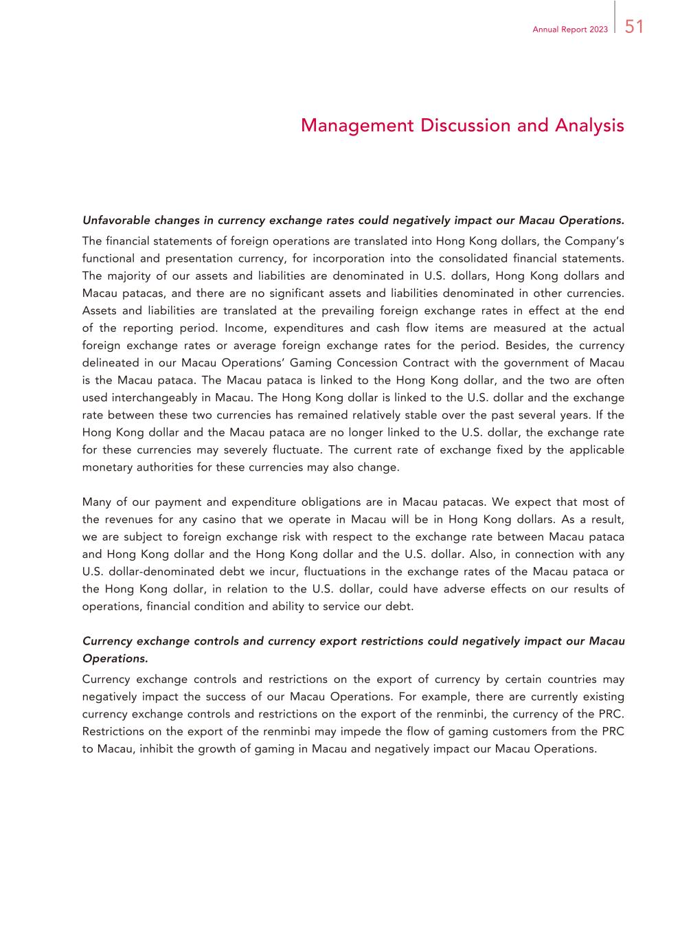 51Annual Report 2023 Management Discussion and Analysis Unfavorable changes in currency exchange rates could negatively impact our Macau Operations. The financial statements of foreign operations are translated into Hong Kong dollars, the Company’s functional and presentation currency, for incorporation into the consolidated financial statements. The majority of our assets and liabilities are denominated in U.S. dollars, Hong Kong dollars and Macau patacas, and there are no significant assets and liabilities denominated in other currencies. Assets and liabilities are translated at the prevailing foreign exchange rates in effect at the end of the reporting period. Income, expenditures and cash flow items are measured at the actual foreign exchange rates or average foreign exchange rates for the period. Besides, the currency delineated in our Macau Operations’ Gaming Concession Contract with the government of Macau is the Macau pataca. The Macau pataca is linked to the Hong Kong dollar, and the two are often used interchangeably in Macau. The Hong Kong dollar is linked to the U.S. dollar and the exchange rate between these two currencies has remained relatively stable over the past several years. If the Hong Kong dollar and the Macau pataca are no longer linked to the U.S. dollar, the exchange rate for these currencies may severely fluctuate. The current rate of exchange fixed by the applicable monetary authorities for these currencies may also change. Many of our payment and expenditure obligations are in Macau patacas. We expect that most of the revenues for any casino that we operate in Macau will be in Hong Kong dollars. As a result, we are subject to foreign exchange risk with respect to the exchange rate between Macau pataca and Hong Kong dollar and the Hong Kong dollar and the U.S. dollar. Also, in connection with any U.S. dollar-denominated debt we incur, fluctuations in the exchange rates of the Macau pataca or the Hong Kong dollar, in relation to the U.S. dollar, could have adverse effects on our results of operations, financial condition and ability to service our debt. Currency exchange controls and currency export restrictions could negatively impact our Macau Operations. Currency exchange controls and restrictions on the export of currency by certain countries may negatively impact the success of our Macau Operations. For example, there are currently existing currency exchange controls and restrictions on the export of the renminbi, the currency of the PRC. Restrictions on the export of the renminbi may impede the flow of gaming customers from the PRC to Macau, inhibit the growth of gaming in Macau and negatively impact our Macau Operations.