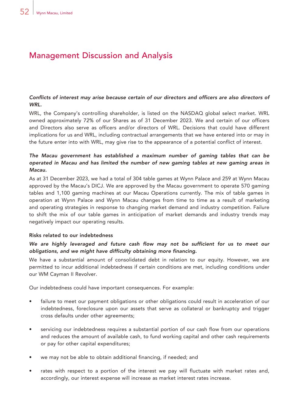 52 Wynn Macau, Limited Management Discussion and Analysis Conflicts of interest may arise because certain of our directors and officers are also directors of WRL. WRL, the Company’s controlling shareholder, is listed on the NASDAQ global select market. WRL owned approximately 72% of our Shares as of 31 December 2023. We and certain of our officers and Directors also serve as officers and/or directors of WRL. Decisions that could have different implications for us and WRL, including contractual arrangements that we have entered into or may in the future enter into with WRL, may give rise to the appearance of a potential conflict of interest. The Macau government has established a maximum number of gaming tables that can be operated in Macau and has limited the number of new gaming tables at new gaming areas in Macau. As at 31 December 2023, we had a total of 304 table games at Wynn Palace and 259 at Wynn Macau approved by the Macau’s DICJ. We are approved by the Macau government to operate 570 gaming tables and 1,100 gaming machines at our Macau Operations currently. The mix of table games in operation at Wynn Palace and Wynn Macau changes from time to time as a result of marketing and operating strategies in response to changing market demand and industry competition. Failure to shift the mix of our table games in anticipation of market demands and industry trends may negatively impact our operating results. Risks related to our indebtedness We are highly leveraged and future cash flow may not be sufficient for us to meet our obligations, and we might have difficulty obtaining more financing. We have a substantial amount of consolidated debt in relation to our equity. However, we are permitted to incur additional indebtedness if certain conditions are met, including conditions under our WM Cayman II Revolver. Our indebtedness could have important consequences. For example: • failure to meet our payment obligations or other obligations could result in acceleration of our indebtedness, foreclosure upon our assets that serve as collateral or bankruptcy and trigger cross defaults under other agreements; • servicing our indebtedness requires a substantial portion of our cash flow from our operations and reduces the amount of available cash, to fund working capital and other cash requirements or pay for other capital expenditures; • we may not be able to obtain additional financing, if needed; and • rates with respect to a portion of the interest we pay will fluctuate with market rates and, accordingly, our interest expense will increase as market interest rates increase.