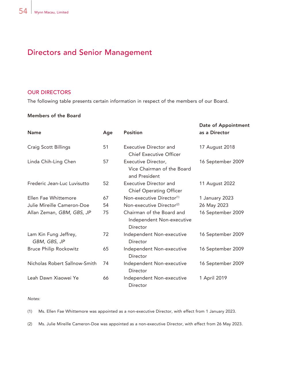 54 Wynn Macau, Limited Directors and Senior Management OUR DIRECTORS The following table presents certain information in respect of the members of our Board. Members of the Board Name Age Position Date of Appointment as a Director Craig Scott Billings 51 Executive Director and Chief Executive Officer 17 August 2018 Linda Chih-Ling Chen 57 Executive Director, Vice Chairman of the Board and President 16 September 2009 Frederic Jean-Luc Luvisutto 52 Executive Director and Chief Operating Officer 11 August 2022 Ellen Fae Whittemore 67 Non-executive Director(1) 1 January 2023 Julie Mireille Cameron-Doe 54 Non-executive Director(2) 26 May 2023 Allan Zeman, GBM, GBS, JP 75 Chairman of the Board and Independent Non-executive Director 16 September 2009 Lam Kin Fung Jeffrey, GBM, GBS, JP 72 Independent Non-executive Director 16 September 2009 Bruce Philip Rockowitz 65 Independent Non-executive Director 16 September 2009 Nicholas Robert Sallnow-Smith 74 Independent Non-executive Director 16 September 2009 Leah Dawn Xiaowei Ye 66 Independent Non-executive Director 1 April 2019 Notes: (1) Ms. Ellen Fae Whittemore was appointed as a non-executive Director, with effect from 1 January 2023. (2) Ms. Julie Mireille Cameron-Doe was appointed as a non-executive Director, with effect from 26 May 2023.