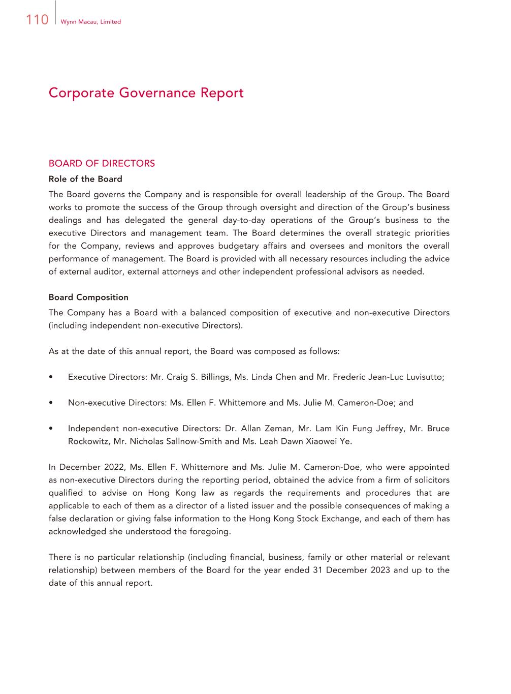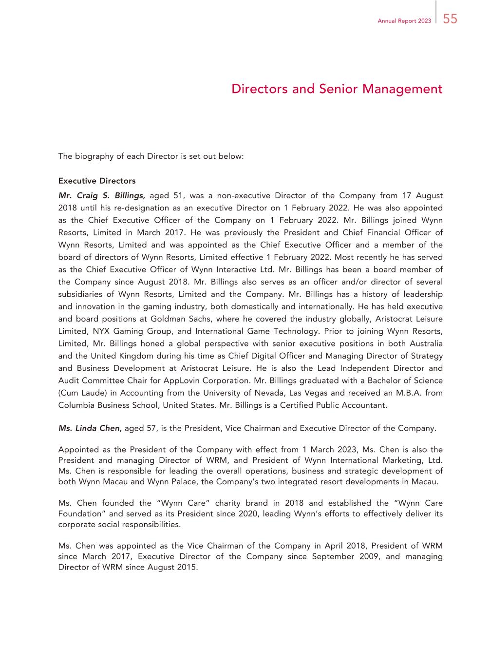55Annual Report 2023 Directors and Senior Management The biography of each Director is set out below: Executive Directors Mr. Craig S. Billings, aged 51, was a non-executive Director of the Company from 17 August 2018 until his re-designation as an executive Director on 1 February 2022. He was also appointed as the Chief Executive Officer of the Company on 1 February 2022. Mr. Billings joined Wynn Resorts, Limited in March 2017. He was previously the President and Chief Financial Officer of Wynn Resorts, Limited and was appointed as the Chief Executive Officer and a member of the board of directors of Wynn Resorts, Limited effective 1 February 2022. Most recently he has served as the Chief Executive Officer of Wynn Interactive Ltd. Mr. Billings has been a board member of the Company since August 2018. Mr. Billings also serves as an officer and/or director of several subsidiaries of Wynn Resorts, Limited and the Company. Mr. Billings has a history of leadership and innovation in the gaming industry, both domestically and internationally. He has held executive and board positions at Goldman Sachs, where he covered the industry globally, Aristocrat Leisure Limited, NYX Gaming Group, and International Game Technology. Prior to joining Wynn Resorts, Limited, Mr. Billings honed a global perspective with senior executive positions in both Australia and the United Kingdom during his time as Chief Digital Officer and Managing Director of Strategy and Business Development at Aristocrat Leisure. He is also the Lead Independent Director and Audit Committee Chair for AppLovin Corporation. Mr. Billings graduated with a Bachelor of Science (Cum Laude) in Accounting from the University of Nevada, Las Vegas and received an M.B.A. from Columbia Business School, United States. Mr. Billings is a Certified Public Accountant. Ms. Linda Chen, aged 57, is the President, Vice Chairman and Executive Director of the Company. Appointed as the President of the Company with effect from 1 March 2023, Ms. Chen is also the President and managing Director of WRM, and President of Wynn International Marketing, Ltd. Ms. Chen is responsible for leading the overall operations, business and strategic development of both Wynn Macau and Wynn Palace, the Company’s two integrated resort developments in Macau. Ms. Chen founded the “Wynn Care” charity brand in 2018 and established the “Wynn Care Foundation” and served as its President since 2020, leading Wynn’s efforts to effectively deliver its corporate social responsibilities. Ms. Chen was appointed as the Vice Chairman of the Company in April 2018, President of WRM since March 2017, Executive Director of the Company since September 2009, and managing Director of WRM since August 2015.