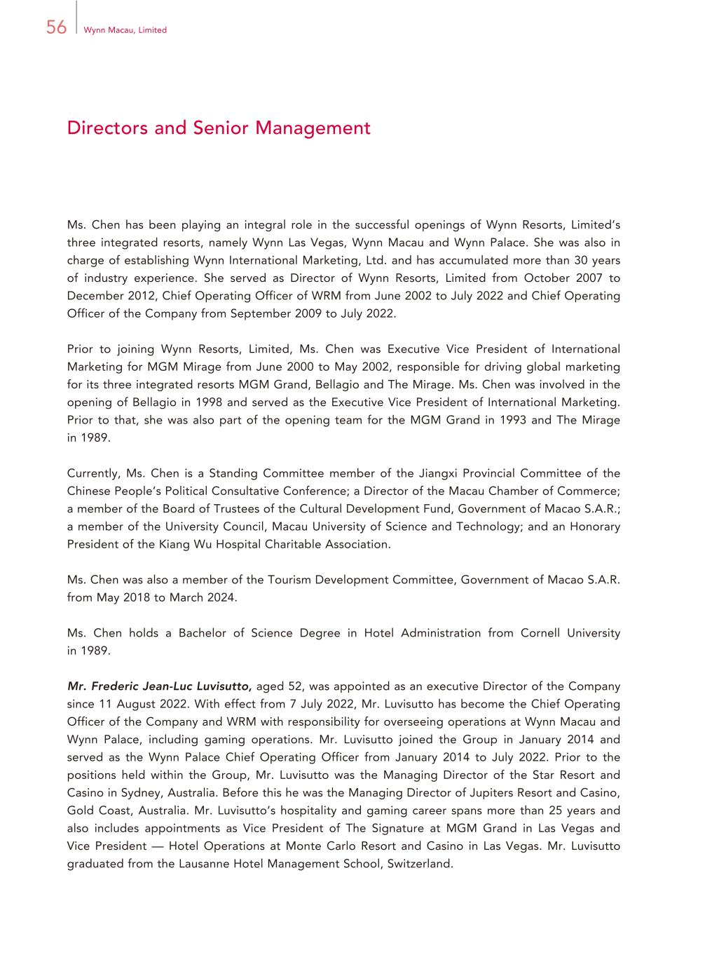 56 Wynn Macau, Limited Directors and Senior Management Ms. Chen has been playing an integral role in the successful openings of Wynn Resorts, Limited’s three integrated resorts, namely Wynn Las Vegas, Wynn Macau and Wynn Palace. She was also in charge of establishing Wynn International Marketing, Ltd. and has accumulated more than 30 years of industry experience. She served as Director of Wynn Resorts, Limited from October 2007 to December 2012, Chief Operating Officer of WRM from June 2002 to July 2022 and Chief Operating Officer of the Company from September 2009 to July 2022. Prior to joining Wynn Resorts, Limited, Ms. Chen was Executive Vice President of International Marketing for MGM Mirage from June 2000 to May 2002, responsible for driving global marketing for its three integrated resorts MGM Grand, Bellagio and The Mirage. Ms. Chen was involved in the opening of Bellagio in 1998 and served as the Executive Vice President of International Marketing. Prior to that, she was also part of the opening team for the MGM Grand in 1993 and The Mirage in 1989. Currently, Ms. Chen is a Standing Committee member of the Jiangxi Provincial Committee of the Chinese People’s Political Consultative Conference; a Director of the Macau Chamber of Commerce; a member of the Board of Trustees of the Cultural Development Fund, Government of Macao S.A.R.; a member of the University Council, Macau University of Science and Technology; and an Honorary President of the Kiang Wu Hospital Charitable Association. Ms. Chen was also a member of the Tourism Development Committee, Government of Macao S.A.R. from May 2018 to March 2024. Ms. Chen holds a Bachelor of Science Degree in Hotel Administration from Cornell University in 1989. Mr. Frederic Jean-Luc Luvisutto, aged 52, was appointed as an executive Director of the Company since 11 August 2022. With effect from 7 July 2022, Mr. Luvisutto has become the Chief Operating Officer of the Company and WRM with responsibility for overseeing operations at Wynn Macau and Wynn Palace, including gaming operations. Mr. Luvisutto joined the Group in January 2014 and served as the Wynn Palace Chief Operating Officer from January 2014 to July 2022. Prior to the positions held within the Group, Mr. Luvisutto was the Managing Director of the Star Resort and Casino in Sydney, Australia. Before this he was the Managing Director of Jupiters Resort and Casino, Gold Coast, Australia. Mr. Luvisutto’s hospitality and gaming career spans more than 25 years and also includes appointments as Vice President of The Signature at MGM Grand in Las Vegas and Vice President — Hotel Operations at Monte Carlo Resort and Casino in Las Vegas. Mr. Luvisutto graduated from the Lausanne Hotel Management School, Switzerland.