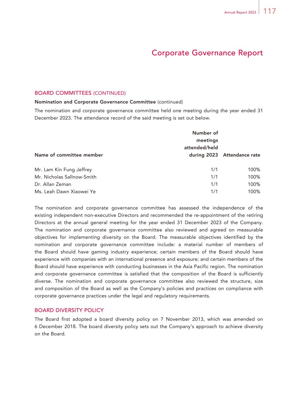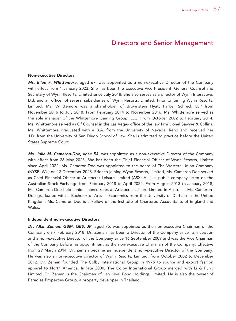 57Annual Report 2023 Directors and Senior Management Non-executive Directors Ms. Ellen F. Whittemore, aged 67, was appointed as a non-executive Director of the Company with effect from 1 January 2023. She has been the Executive Vice President, General Counsel and Secretary of Wynn Resorts, Limited since July 2018. She also serves as a director of Wynn Interactive, Ltd. and an officer of several subsidiaries of Wynn Resorts, Limited. Prior to joining Wynn Resorts, Limited, Ms. Whittemore was a shareholder of Brownstein Hyatt Farber Schreck LLP from November 2016 to July 2018. From February 2014 to November 2016, Ms. Whittemore served as the sole manager of the Whittemore Gaming Group, LLC. From October 2002 to February 2014, Ms. Whittemore served as Of Counsel in the Las Vegas office of the law firm Lionel Sawyer & Collins. Ms. Whittemore graduated with a B.A. from the University of Nevada, Reno and received her J.D. from the University of San Diego School of Law. She is admitted to practice before the United States Supreme Court. Ms. Julie M. Cameron-Doe, aged 54, was appointed as a non-executive Director of the Company with effect from 26 May 2023. She has been the Chief Financial Officer of Wynn Resorts, Limited since April 2022. Ms. Cameron-Doe was appointed to the board of The Western Union Company (NYSE: WU) on 12 December 2023. Prior to joining Wynn Resorts, Limited, Ms. Cameron-Doe served as Chief Financial Officer at Aristocrat Leisure Limited (ASX: ALL), a public company listed on the Australian Stock Exchange from February 2018 to April 2022. From August 2013 to January 2018, Ms. Cameron-Doe held senior finance roles at Aristocrat Leisure Limited in Australia. Ms. Cameron- Doe graduated with a Bachelor of Arts in Economics from the University of Durham in the United Kingdom. Ms. Cameron-Doe is a Fellow of the Institute of Chartered Accountants of England and Wales. Independent non-executive Directors Dr. Allan Zeman, GBM, GBS, JP, aged 75, was appointed as the non-executive Chairman of the Company on 7 February 2018. Dr. Zeman has been a Director of the Company since its inception and a non-executive Director of the Company since 16 September 2009 and was the Vice Chairman of the Company before his appointment as the non-executive Chairman of the Company. Effective from 29 March 2014, Dr. Zeman became an independent non-executive Director of the Company. He was also a non-executive director of Wynn Resorts, Limited, from October 2002 to December 2012. Dr. Zeman founded The Colby International Group in 1975 to source and export fashion apparel to North America. In late 2000, The Colby International Group merged with Li & Fung Limited. Dr. Zeman is the Chairman of Lan Kwai Fong Holdings Limited. He is also the owner of Paradise Properties Group, a property developer in Thailand.