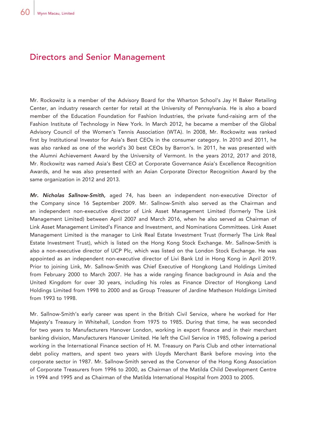 60 Wynn Macau, Limited Directors and Senior Management Mr. Rockowitz is a member of the Advisory Board for the Wharton School’s Jay H Baker Retailing Center, an industry research center for retail at the University of Pennsylvania. He is also a board member of the Education Foundation for Fashion Industries, the private fund-raising arm of the Fashion Institute of Technology in New York. In March 2012, he became a member of the Global Advisory Council of the Women’s Tennis Association (WTA). In 2008, Mr. Rockowitz was ranked first by Institutional Investor for Asia’s Best CEOs in the consumer category. In 2010 and 2011, he was also ranked as one of the world’s 30 best CEOs by Barron’s. In 2011, he was presented with the Alumni Achievement Award by the University of Vermont. In the years 2012, 2017 and 2018, Mr. Rockowitz was named Asia’s Best CEO at Corporate Governance Asia’s Excellence Recognition Awards, and he was also presented with an Asian Corporate Director Recognition Award by the same organization in 2012 and 2013. Mr. Nicholas Sallnow-Smith, aged 74, has been an independent non-executive Director of the Company since 16 September 2009. Mr. Sallnow-Smith also served as the Chairman and an independent non-executive director of Link Asset Management Limited (formerly The Link Management Limited) between April 2007 and March 2016, when he also served as Chairman of Link Asset Management Limited’s Finance and Investment, and Nominations Committees. Link Asset Management Limited is the manager to Link Real Estate Investment Trust (formerly The Link Real Estate Investment Trust), which is listed on the Hong Kong Stock Exchange. Mr. Sallnow-Smith is also a non-executive director of UCP Plc, which was listed on the London Stock Exchange. He was appointed as an independent non-executive director of Livi Bank Ltd in Hong Kong in April 2019. Prior to joining Link, Mr. Sallnow-Smith was Chief Executive of Hongkong Land Holdings Limited from February 2000 to March 2007. He has a wide ranging finance background in Asia and the United Kingdom for over 30 years, including his roles as Finance Director of Hongkong Land Holdings Limited from 1998 to 2000 and as Group Treasurer of Jardine Matheson Holdings Limited from 1993 to 1998. Mr. Sallnow-Smith’s early career was spent in the British Civil Service, where he worked for Her Majesty’s Treasury in Whitehall, London from 1975 to 1985. During that time, he was seconded for two years to Manufacturers Hanover London, working in export finance and in their merchant banking division, Manufacturers Hanover Limited. He left the Civil Service in 1985, following a period working in the International Finance section of H. M. Treasury on Paris Club and other international debt policy matters, and spent two years with Lloyds Merchant Bank before moving into the corporate sector in 1987. Mr. Sallnow-Smith served as the Convenor of the Hong Kong Association of Corporate Treasurers from 1996 to 2000, as Chairman of the Matilda Child Development Centre in 1994 and 1995 and as Chairman of the Matilda International Hospital from 2003 to 2005.