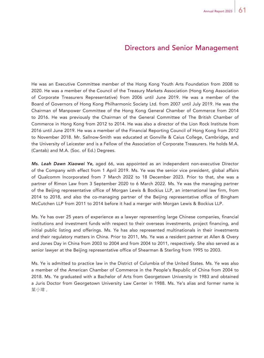 61Annual Report 2023 Directors and Senior Management He was an Executive Committee member of the Hong Kong Youth Arts Foundation from 2008 to 2020. He was a member of the Council of the Treasury Markets Association (Hong Kong Association of Corporate Treasurers Representative) from 2006 until June 2019. He was a member of the Board of Governors of Hong Kong Philharmonic Society Ltd. from 2007 until July 2019. He was the Chairman of Manpower Committee of the Hong Kong General Chamber of Commerce from 2014 to 2016. He was previously the Chairman of the General Committee of The British Chamber of Commerce in Hong Kong from 2012 to 2014. He was also a director of the Lion Rock Institute from 2016 until June 2019. He was a member of the Financial Reporting Council of Hong Kong from 2012 to November 2018. Mr. Sallnow-Smith was educated at Gonville & Caius College, Cambridge, and the University of Leicester and is a Fellow of the Association of Corporate Treasurers. He holds M.A. (Cantab) and M.A. (Soc. of Ed.) Degrees. Ms. Leah Dawn Xiaowei Ye, aged 66, was appointed as an independent non-executive Director of the Company with effect from 1 April 2019. Ms. Ye was the senior vice president, global affairs of Qualcomm Incorporated from 7 March 2022 to 18 December 2023. Prior to that, she was a partner of Rimon Law from 3 September 2020 to 6 March 2022. Ms. Ye was the managing partner of the Beijing representative office of Morgan Lewis & Bockius LLP, an international law firm, from 2014 to 2018, and also the co-managing partner of the Beijing representative office of Bingham McCutchen LLP from 2011 to 2014 before it had a merger with Morgan Lewis & Bockius LLP. Ms. Ye has over 25 years of experience as a lawyer representing large Chinese companies, financial institutions and investment funds with respect to their overseas investments, project financing, and initial public listing and offerings. Ms. Ye has also represented multinationals in their investments and their regulatory matters in China. Prior to 2011, Ms. Ye was a resident partner at Allen & Overy and Jones Day in China from 2003 to 2004 and from 2004 to 2011, respectively. She also served as a senior lawyer at the Beijing representative office of Shearman & Sterling from 1995 to 2003. Ms. Ye is admitted to practice law in the District of Columbia of the United States. Ms. Ye was also a member of the American Chamber of Commerce in the People’s Republic of China from 2004 to 2018. Ms. Ye graduated with a Bachelor of Arts from Georgetown University in 1983 and obtained a Juris Doctor from Georgetown University Law Center in 1988. Ms. Ye’s alias and former name is 葉小瑋 .
