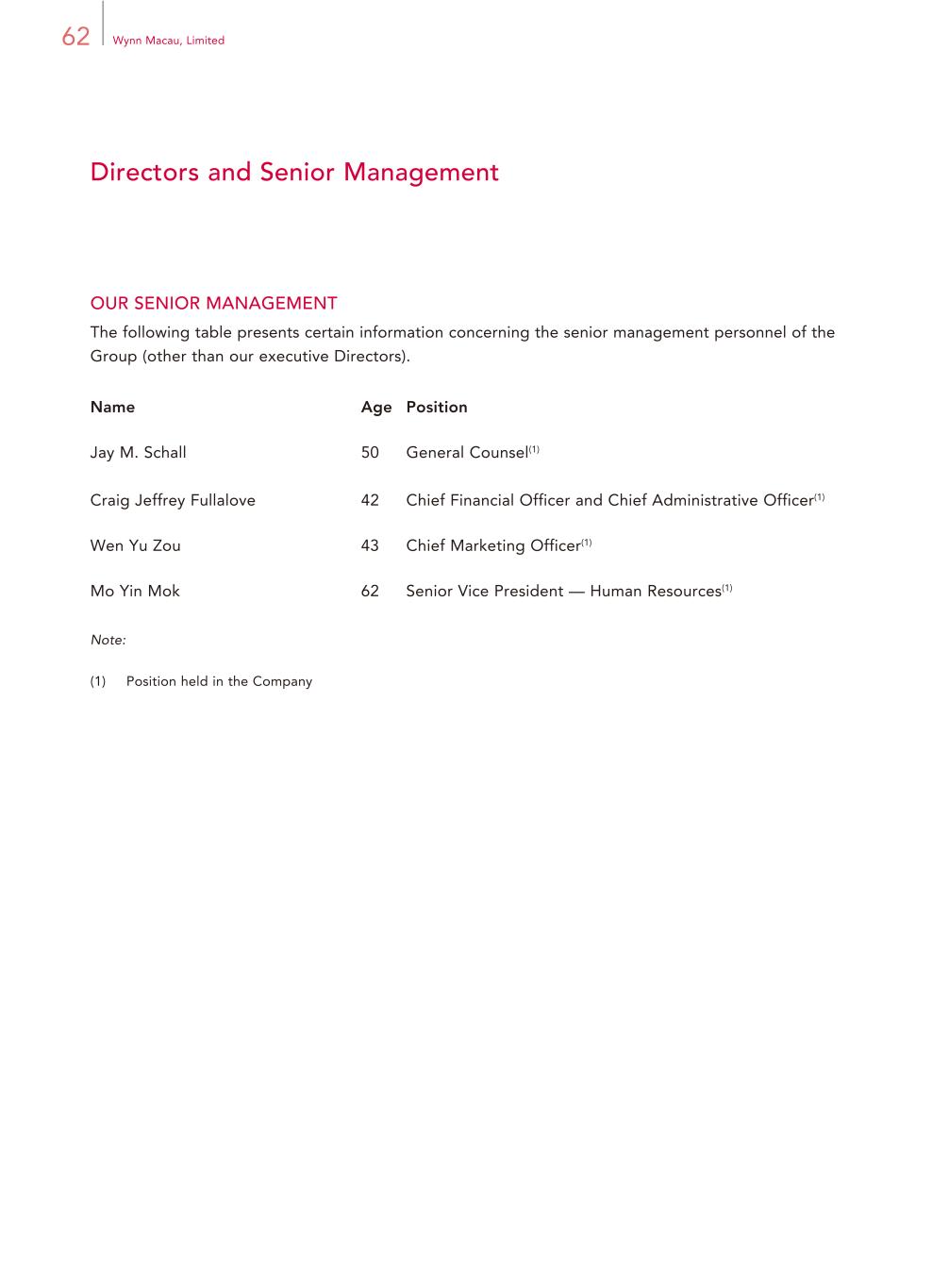 62 Wynn Macau, Limited Directors and Senior Management OUR SENIOR MANAGEMENT The following table presents certain information concerning the senior management personnel of the Group (other than our executive Directors). Name Age Position Jay M. Schall 50 General Counsel(1) Craig Jeffrey Fullalove 42 Chief Financial Officer and Chief Administrative Officer(1) Wen Yu Zou 43 Chief Marketing Officer(1) Mo Yin Mok 62 Senior Vice President — Human Resources(1) Note: (1) Position held in the Company