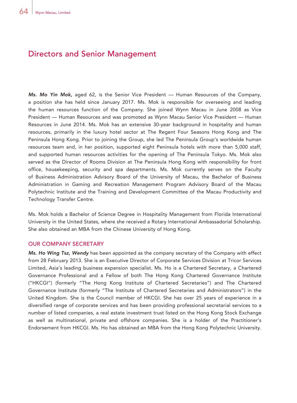 64 Wynn Macau, Limited Directors and Senior Management Ms. Mo Yin Mok, aged 62, is the Senior Vice President — Human Resources of the Company, a position she has held since January 2017. Ms. Mok is responsible for overseeing and leading the human resources function of the Company. She joined Wynn Macau in June 2008 as Vice President — Human Resources and was promoted as Wynn Macau Senior Vice President — Human Resources in June 2014. Ms. Mok has an extensive 30-year background in hospitality and human resources, primarily in the luxury hotel sector at The Regent Four Seasons Hong Kong and The Peninsula Hong Kong. Prior to joining the Group, she led The Peninsula Group’s worldwide human resources team and, in her position, supported eight Peninsula hotels with more than 5,000 staff, and supported human resources activities for the opening of The Peninsula Tokyo. Ms. Mok also served as the Director of Rooms Division at The Peninsula Hong Kong with responsibility for front office, housekeeping, security and spa departments. Ms. Mok currently serves on the Faculty of Business Administration Advisory Board of the University of Macau, the Bachelor of Business Administration in Gaming and Recreation Management Program Advisory Board of the Macau Polytechnic Institute and the Training and Development Committee of the Macau Productivity and Technology Transfer Centre. Ms. Mok holds a Bachelor of Science Degree in Hospitality Management from Florida International University in the United States, where she received a Rotary International Ambassadorial Scholarship. She also obtained an MBA from the Chinese University of Hong Kong. OUR COMPANY SECRETARY Ms. Ho Wing Tsz, Wendy has been appointed as the company secretary of the Company with effect from 28 February 2013. She is an Executive Director of Corporate Services Division at Tricor Services Limited, Asia’s leading business expansion specialist. Ms. Ho is a Chartered Secretary, a Chartered Governance Professional and a Fellow of both The Hong Kong Chartered Governance Institute (“HKCGI”) (formerly “The Hong Kong Institute of Chartered Secretaries”) and The Chartered Governance Institute (formerly “The Institute of Chartered Secretaries and Administrators”) in the United Kingdom. She is the Council member of HKCGI. She has over 25 years of experience in a diversified range of corporate services and has been providing professional secretarial services to a number of listed companies, a real estate investment trust listed on the Hong Kong Stock Exchange as well as multinational, private and offshore companies. She is a holder of the Practitioner’s Endorsement from HKCGI. Ms. Ho has obtained an MBA from the Hong Kong Polytechnic University.