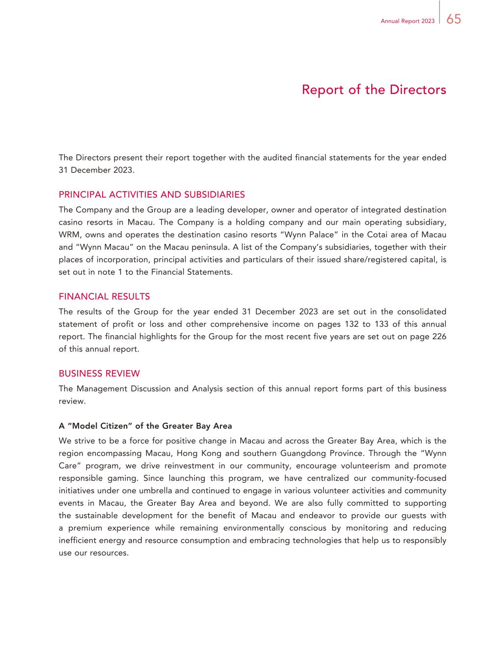 65Annual Report 2023 Report of the Directors The Directors present their report together with the audited financial statements for the year ended 31 December 2023. PRINCIPAL ACTIVITIES AND SUBSIDIARIES The Company and the Group are a leading developer, owner and operator of integrated destination casino resorts in Macau. The Company is a holding company and our main operating subsidiary, WRM, owns and operates the destination casino resorts “Wynn Palace” in the Cotai area of Macau and “Wynn Macau” on the Macau peninsula. A list of the Company’s subsidiaries, together with their places of incorporation, principal activities and particulars of their issued share/registered capital, is set out in note 1 to the Financial Statements. FINANCIAL RESULTS The results of the Group for the year ended 31 December 2023 are set out in the consolidated statement of profit or loss and other comprehensive income on pages 132 to 133 of this annual report. The financial highlights for the Group for the most recent five years are set out on page 226 of this annual report. BUSINESS REVIEW The Management Discussion and Analysis section of this annual report forms part of this business review. A “Model Citizen” of the Greater Bay Area We strive to be a force for positive change in Macau and across the Greater Bay Area, which is the region encompassing Macau, Hong Kong and southern Guangdong Province. Through the “Wynn Care” program, we drive reinvestment in our community, encourage volunteerism and promote responsible gaming. Since launching this program, we have centralized our community-focused initiatives under one umbrella and continued to engage in various volunteer activities and community events in Macau, the Greater Bay Area and beyond. We are also fully committed to supporting the sustainable development for the benefit of Macau and endeavor to provide our guests with a premium experience while remaining environmentally conscious by monitoring and reducing inefficient energy and resource consumption and embracing technologies that help us to responsibly use our resources.