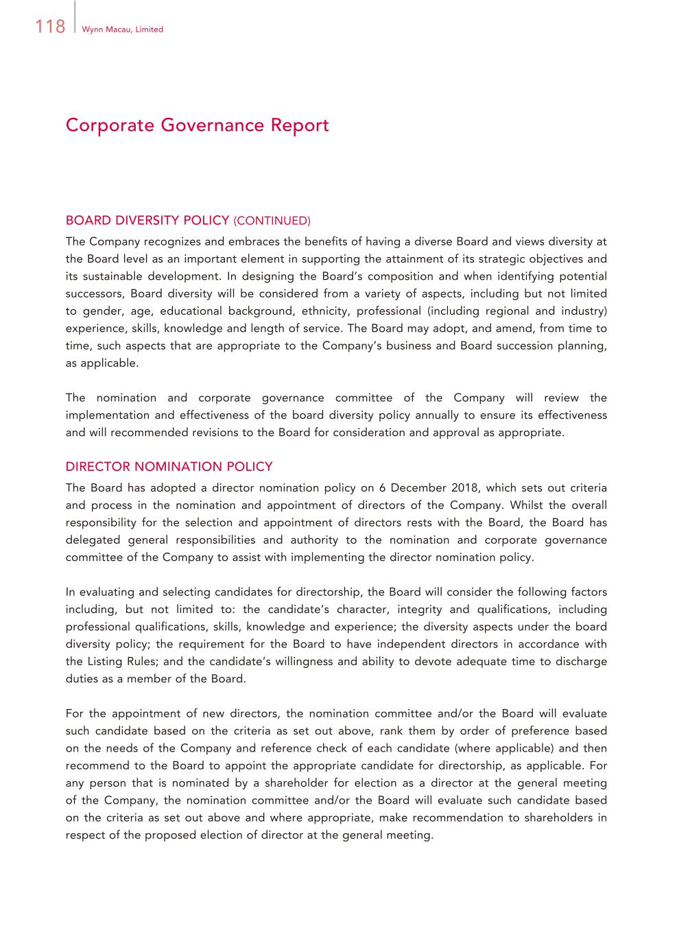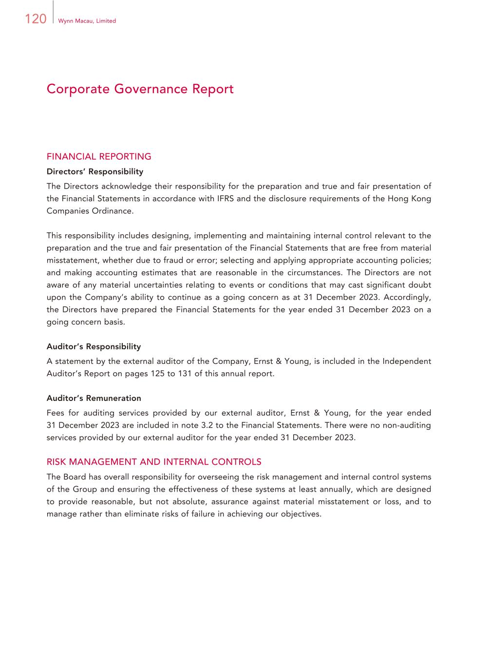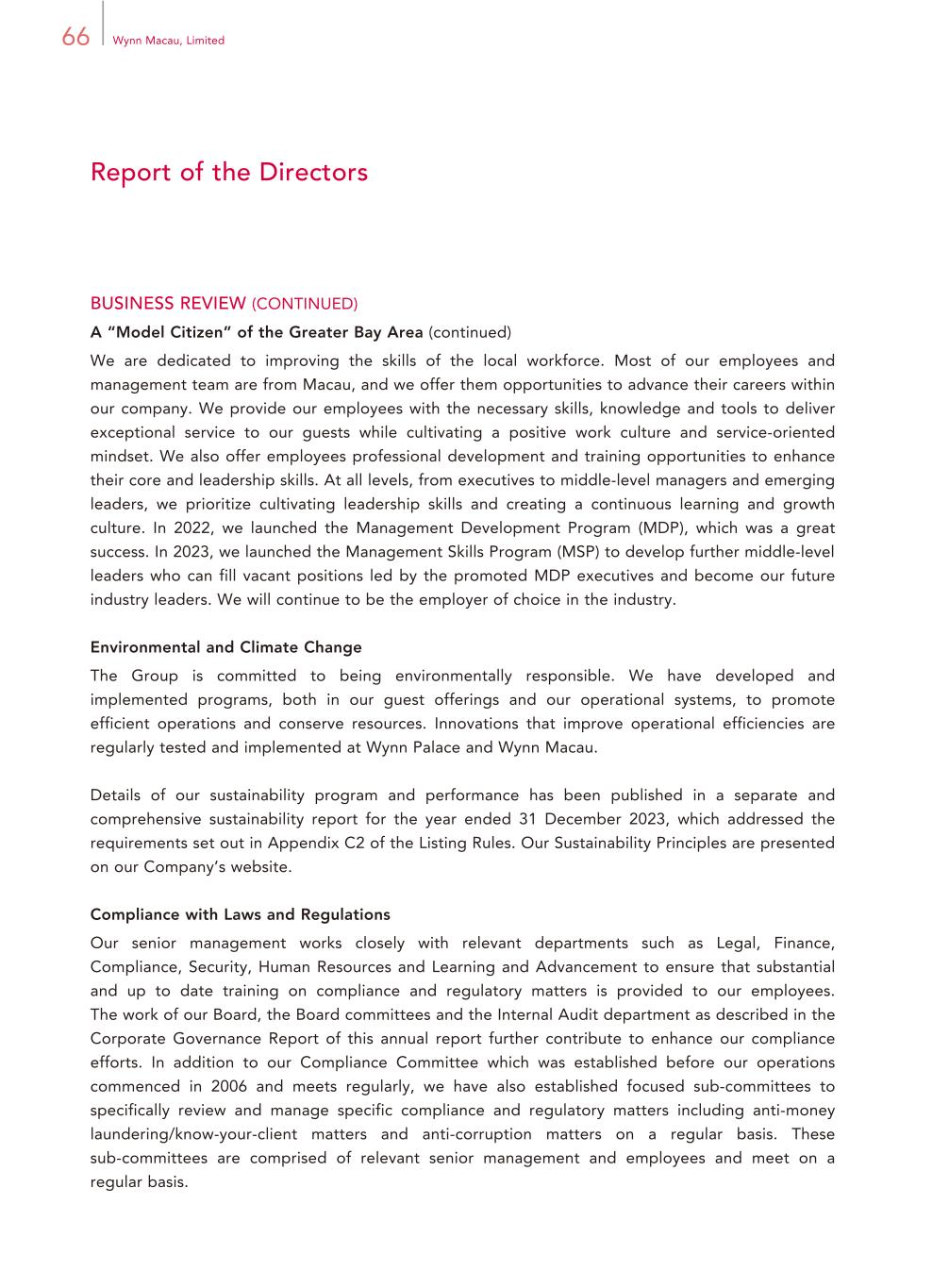 66 Wynn Macau, Limited Report of the Directors BUSINESS REVIEW (CONTINUED) A “Model Citizen” of the Greater Bay Area (continued) We are dedicated to improving the skills of the local workforce. Most of our employees and management team are from Macau, and we offer them opportunities to advance their careers within our company. We provide our employees with the necessary skills, knowledge and tools to deliver exceptional service to our guests while cultivating a positive work culture and service-oriented mindset. We also offer employees professional development and training opportunities to enhance their core and leadership skills. At all levels, from executives to middle-level managers and emerging leaders, we prioritize cultivating leadership skills and creating a continuous learning and growth culture. In 2022, we launched the Management Development Program (MDP), which was a great success. In 2023, we launched the Management Skills Program (MSP) to develop further middle-level leaders who can fill vacant positions led by the promoted MDP executives and become our future industry leaders. We will continue to be the employer of choice in the industry. Environmental and Climate Change The Group is committed to being environmentally responsible. We have developed and implemented programs, both in our guest offerings and our operational systems, to promote efficient operations and conserve resources. Innovations that improve operational efficiencies are regularly tested and implemented at Wynn Palace and Wynn Macau. Details of our sustainability program and performance has been published in a separate and comprehensive sustainability report for the year ended 31 December 2023, which addressed the requirements set out in Appendix C2 of the Listing Rules. Our Sustainability Principles are presented on our Company’s website. Compliance with Laws and Regulations Our senior management works closely with relevant departments such as Legal, Finance, Compliance, Security, Human Resources and Learning and Advancement to ensure that substantial and up to date training on compliance and regulatory matters is provided to our employees. The work of our Board, the Board committees and the Internal Audit department as described in the Corporate Governance Report of this annual report further contribute to enhance our compliance efforts. In addition to our Compliance Committee which was established before our operations commenced in 2006 and meets regularly, we have also established focused sub-committees to specifically review and manage specific compliance and regulatory matters including anti-money laundering/know-your-client matters and anti-corruption matters on a regular basis. These sub-committees are comprised of relevant senior management and employees and meet on a regular basis.
