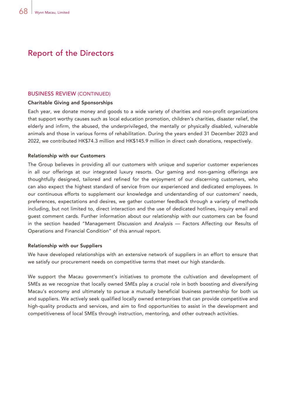 68 Wynn Macau, Limited Report of the Directors BUSINESS REVIEW (CONTINUED) Charitable Giving and Sponsorships Each year, we donate money and goods to a wide variety of charities and non-profit organizations that support worthy causes such as local education promotion, children’s charities, disaster relief, the elderly and infirm, the abused, the underprivileged, the mentally or physically disabled, vulnerable animals and those in various forms of rehabilitation. During the years ended 31 December 2023 and 2022, we contributed HK$74.3 million and HK$145.9 million in direct cash donations, respectively. Relationship with our Customers The Group believes in providing all our customers with unique and superior customer experiences in all our offerings at our integrated luxury resorts. Our gaming and non-gaming offerings are thoughtfully designed, tailored and refined for the enjoyment of our discerning customers, who can also expect the highest standard of service from our experienced and dedicated employees. In our continuous efforts to supplement our knowledge and understanding of our customers’ needs, preferences, expectations and desires, we gather customer feedback through a variety of methods including, but not limited to, direct interaction and the use of dedicated hotlines, inquiry email and guest comment cards. Further information about our relationship with our customers can be found in the section headed “Management Discussion and Analysis — Factors Affecting our Results of Operations and Financial Condition” of this annual report. Relationship with our Suppliers We have developed relationships with an extensive network of suppliers in an effort to ensure that we satisfy our procurement needs on competitive terms that meet our high standards. We support the Macau government’s initiatives to promote the cultivation and development of SMEs as we recognize that locally owned SMEs play a crucial role in both boosting and diversifying Macau’s economy and ultimately to pursue a mutually beneficial business partnership for both us and suppliers. We actively seek qualified locally owned enterprises that can provide competitive and high-quality products and services, and aim to find opportunities to assist in the development and competitiveness of local SMEs through instruction, mentoring, and other outreach activities.