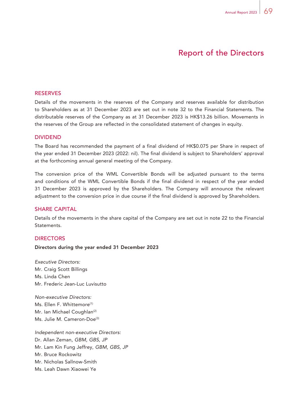 69Annual Report 2023 Report of the Directors RESERVES Details of the movements in the reserves of the Company and reserves available for distribution to Shareholders as at 31 December 2023 are set out in note 32 to the Financial Statements. The distributable reserves of the Company as at 31 December 2023 is HK$13.26 billion. Movements in the reserves of the Group are reflected in the consolidated statement of changes in equity. DIVIDEND The Board has recommended the payment of a final dividend of HK$0.075 per Share in respect of the year ended 31 December 2023 (2022: nil). The final dividend is subject to Shareholders’ approval at the forthcoming annual general meeting of the Company. The conversion price of the WML Convertible Bonds will be adjusted pursuant to the terms and conditions of the WML Convertible Bonds if the final dividend in respect of the year ended 31 December 2023 is approved by the Shareholders. The Company will announce the relevant adjustment to the conversion price in due course if the final dividend is approved by Shareholders. SHARE CAPITAL Details of the movements in the share capital of the Company are set out in note 22 to the Financial Statements. DIRECTORS Directors during the year ended 31 December 2023 Executive Directors: Mr. Craig Scott Billings Ms. Linda Chen Mr. Frederic Jean-Luc Luvisutto Non-executive Directors: Ms. Ellen F. Whittemore(1) Mr. Ian Michael Coughlan(2) Ms. Julie M. Cameron-Doe(3) Independent non-executive Directors: Dr. Allan Zeman, GBM, GBS, JP Mr. Lam Kin Fung Jeffrey, GBM, GBS, JP Mr. Bruce Rockowitz Mr. Nicholas Sallnow-Smith Ms. Leah Dawn Xiaowei Ye
