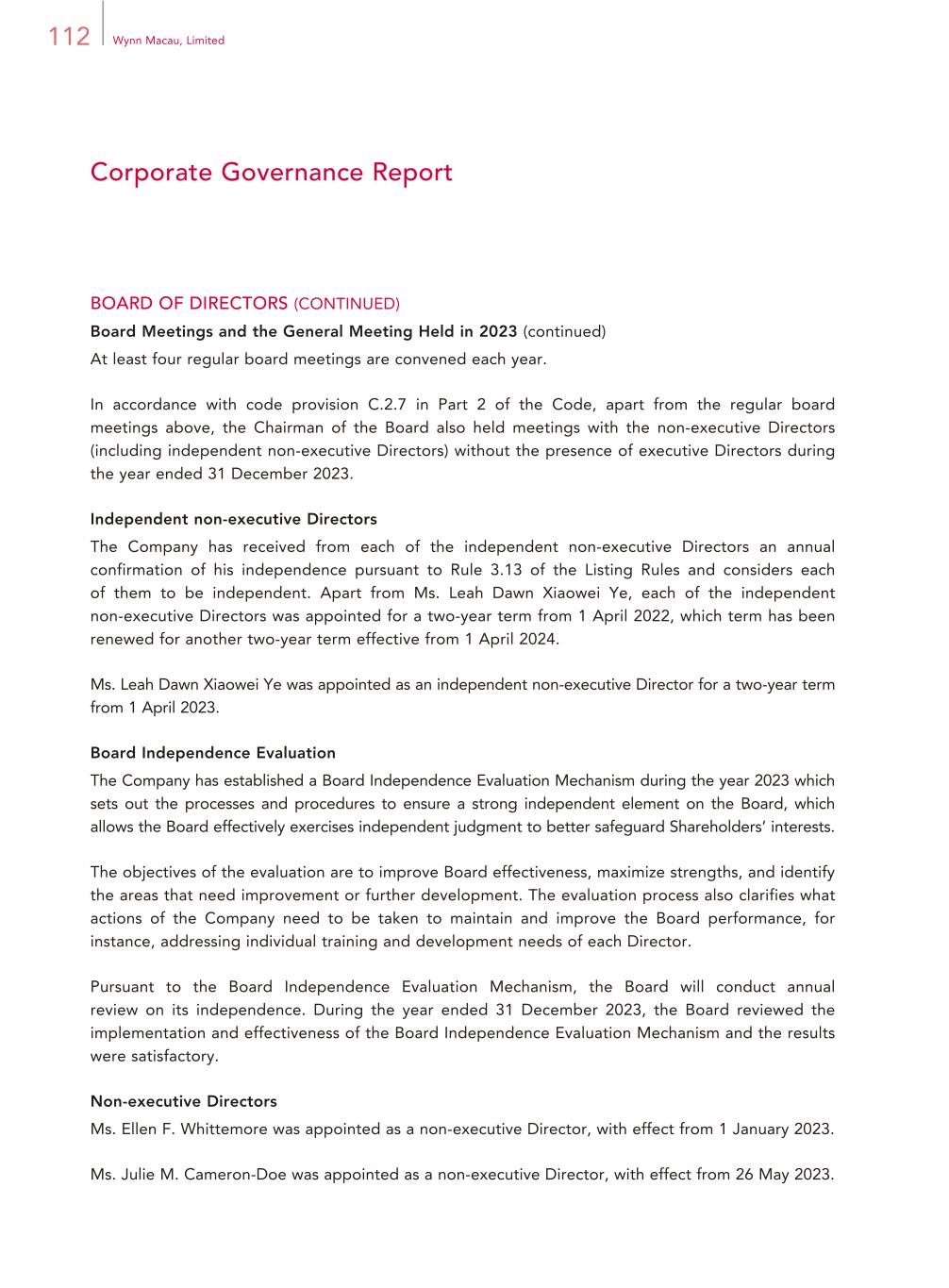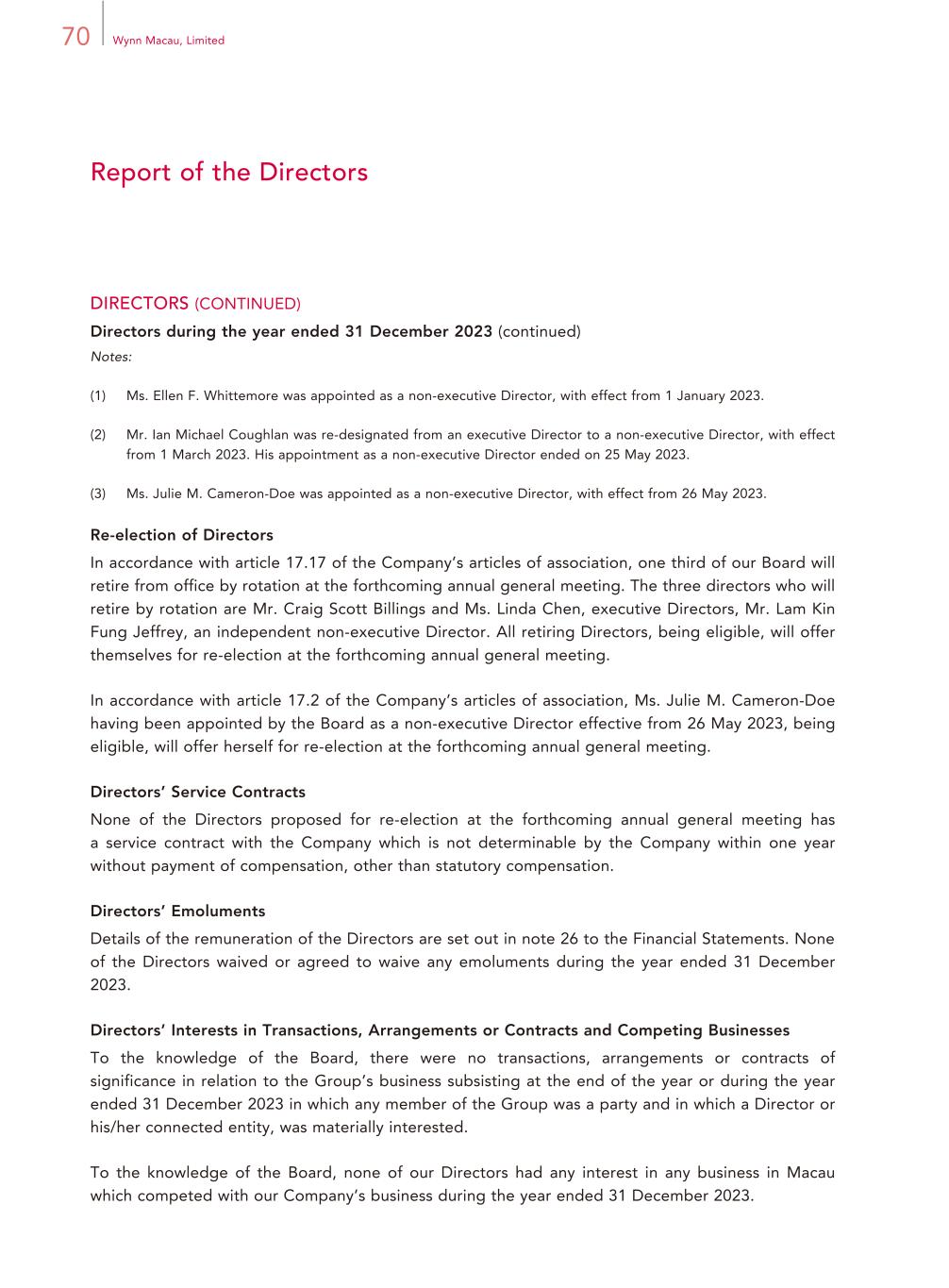 70 Wynn Macau, Limited Report of the Directors DIRECTORS (CONTINUED) Directors during the year ended 31 December 2023 (continued) Notes: (1) Ms. Ellen F. Whittemore was appointed as a non-executive Director, with effect from 1 January 2023. (2) Mr. Ian Michael Coughlan was re-designated from an executive Director to a non-executive Director, with effect from 1 March 2023. His appointment as a non-executive Director ended on 25 May 2023. (3) Ms. Julie M. Cameron-Doe was appointed as a non-executive Director, with effect from 26 May 2023. Re-election of Directors In accordance with article 17.17 of the Company’s articles of association, one third of our Board will retire from office by rotation at the forthcoming annual general meeting. The three directors who will retire by rotation are Mr. Craig Scott Billings and Ms. Linda Chen, executive Directors, Mr. Lam Kin Fung Jeffrey, an independent non-executive Director. All retiring Directors, being eligible, will offer themselves for re-election at the forthcoming annual general meeting. In accordance with article 17.2 of the Company’s articles of association, Ms. Julie M. Cameron-Doe having been appointed by the Board as a non-executive Director effective from 26 May 2023, being eligible, will offer herself for re-election at the forthcoming annual general meeting. Directors’ Service Contracts None of the Directors proposed for re-election at the forthcoming annual general meeting has a service contract with the Company which is not determinable by the Company within one year without payment of compensation, other than statutory compensation. Directors’ Emoluments Details of the remuneration of the Directors are set out in note 26 to the Financial Statements. None of the Directors waived or agreed to waive any emoluments during the year ended 31 December 2023. Directors’ Interests in Transactions, Arrangements or Contracts and Competing Businesses To the knowledge of the Board, there were no transactions, arrangements or contracts of significance in relation to the Group’s business subsisting at the end of the year or during the year ended 31 December 2023 in which any member of the Group was a party and in which a Director or his/her connected entity, was materially interested. To the knowledge of the Board, none of our Directors had any interest in any business in Macau which competed with our Company’s business during the year ended 31 December 2023.