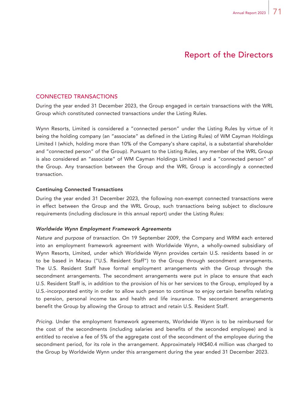71Annual Report 2023 Report of the Directors CONNECTED TRANSACTIONS During the year ended 31 December 2023, the Group engaged in certain transactions with the WRL Group which constituted connected transactions under the Listing Rules. Wynn Resorts, Limited is considered a “connected person” under the Listing Rules by virtue of it being the holding company (an “associate” as defined in the Listing Rules) of WM Cayman Holdings Limited I (which, holding more than 10% of the Company’s share capital, is a substantial shareholder and “connected person” of the Group). Pursuant to the Listing Rules, any member of the WRL Group is also considered an “associate” of WM Cayman Holdings Limited I and a “connected person” of the Group. Any transaction between the Group and the WRL Group is accordingly a connected transaction. Continuing Connected Transactions During the year ended 31 December 2023, the following non-exempt connected transactions were in effect between the Group and the WRL Group, such transactions being subject to disclosure requirements (including disclosure in this annual report) under the Listing Rules: Worldwide Wynn Employment Framework Agreements Nature and purpose of transaction. On 19 September 2009, the Company and WRM each entered into an employment framework agreement with Worldwide Wynn, a wholly-owned subsidiary of Wynn Resorts, Limited, under which Worldwide Wynn provides certain U.S. residents based in or to be based in Macau (“U.S. Resident Staff”) to the Group through secondment arrangements. The U.S. Resident Staff have formal employment arrangements with the Group through the secondment arrangements. The secondment arrangements were put in place to ensure that each U.S. Resident Staff is, in addition to the provision of his or her services to the Group, employed by a U.S.-incorporated entity in order to allow such person to continue to enjoy certain benefits relating to pension, personal income tax and health and life insurance. The secondment arrangements benefit the Group by allowing the Group to attract and retain U.S. Resident Staff. Pricing. Under the employment framework agreements, Worldwide Wynn is to be reimbursed for the cost of the secondments (including salaries and benefits of the seconded employee) and is entitled to receive a fee of 5% of the aggregate cost of the secondment of the employee during the secondment period, for its role in the arrangement. Approximately HK$40.4 million was charged to the Group by Worldwide Wynn under this arrangement during the year ended 31 December 2023.