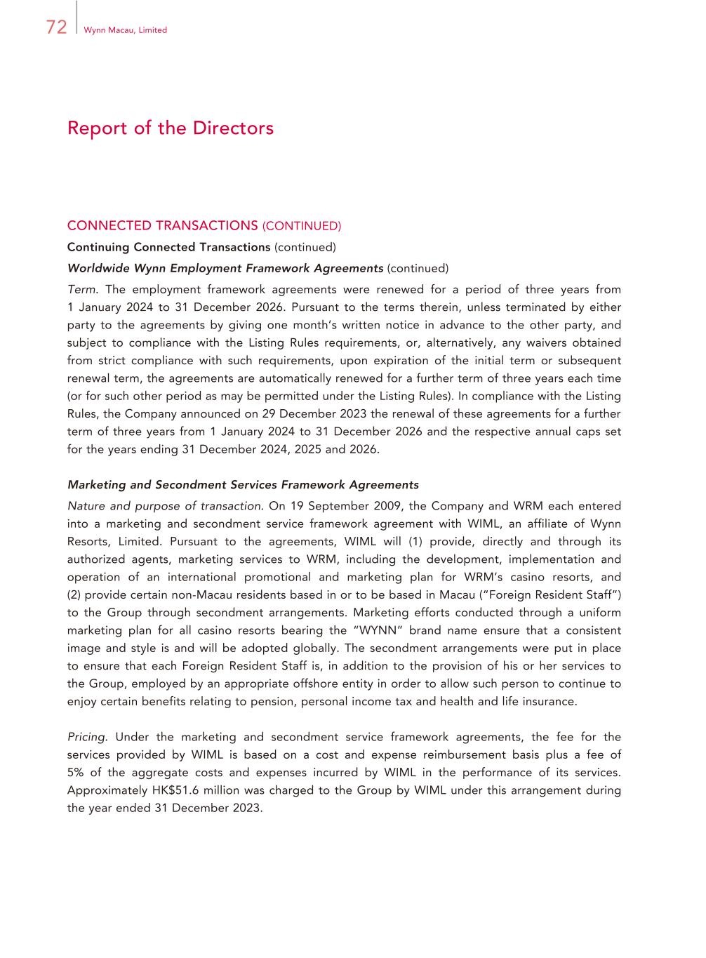 72 Wynn Macau, Limited Report of the Directors CONNECTED TRANSACTIONS (CONTINUED) Continuing Connected Transactions (continued) Worldwide Wynn Employment Framework Agreements (continued) Term. The employment framework agreements were renewed for a period of three years from 1 January 2024 to 31 December 2026. Pursuant to the terms therein, unless terminated by either party to the agreements by giving one month’s written notice in advance to the other party, and subject to compliance with the Listing Rules requirements, or, alternatively, any waivers obtained from strict compliance with such requirements, upon expiration of the initial term or subsequent renewal term, the agreements are automatically renewed for a further term of three years each time (or for such other period as may be permitted under the Listing Rules). In compliance with the Listing Rules, the Company announced on 29 December 2023 the renewal of these agreements for a further term of three years from 1 January 2024 to 31 December 2026 and the respective annual caps set for the years ending 31 December 2024, 2025 and 2026. Marketing and Secondment Services Framework Agreements Nature and purpose of transaction. On 19 September 2009, the Company and WRM each entered into a marketing and secondment service framework agreement with WIML, an affiliate of Wynn Resorts, Limited. Pursuant to the agreements, WIML will (1) provide, directly and through its authorized agents, marketing services to WRM, including the development, implementation and operation of an international promotional and marketing plan for WRM’s casino resorts, and (2) provide certain non-Macau residents based in or to be based in Macau (“Foreign Resident Staff”) to the Group through secondment arrangements. Marketing efforts conducted through a uniform marketing plan for all casino resorts bearing the “WYNN” brand name ensure that a consistent image and style is and will be adopted globally. The secondment arrangements were put in place to ensure that each Foreign Resident Staff is, in addition to the provision of his or her services to the Group, employed by an appropriate offshore entity in order to allow such person to continue to enjoy certain benefits relating to pension, personal income tax and health and life insurance. Pricing. Under the marketing and secondment service framework agreements, the fee for the services provided by WIML is based on a cost and expense reimbursement basis plus a fee of 5% of the aggregate costs and expenses incurred by WIML in the performance of its services. Approximately HK$51.6 million was charged to the Group by WIML under this arrangement during the year ended 31 December 2023.