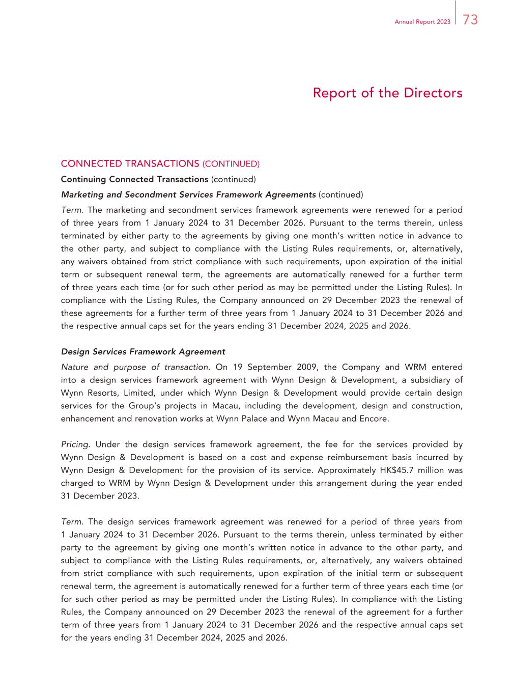 73Annual Report 2023 Report of the Directors CONNECTED TRANSACTIONS (CONTINUED) Continuing Connected Transactions (continued) Marketing and Secondment Services Framework Agreements (continued) Term. The marketing and secondment services framework agreements were renewed for a period of three years from 1 January 2024 to 31 December 2026. Pursuant to the terms therein, unless terminated by either party to the agreements by giving one month’s written notice in advance to the other party, and subject to compliance with the Listing Rules requirements, or, alternatively, any waivers obtained from strict compliance with such requirements, upon expiration of the initial term or subsequent renewal term, the agreements are automatically renewed for a further term of three years each time (or for such other period as may be permitted under the Listing Rules). In compliance with the Listing Rules, the Company announced on 29 December 2023 the renewal of these agreements for a further term of three years from 1 January 2024 to 31 December 2026 and the respective annual caps set for the years ending 31 December 2024, 2025 and 2026. Design Services Framework Agreement Nature and purpose of transaction. On 19 September 2009, the Company and WRM entered into a design services framework agreement with Wynn Design & Development, a subsidiary of Wynn Resorts, Limited, under which Wynn Design & Development would provide certain design services for the Group’s projects in Macau, including the development, design and construction, enhancement and renovation works at Wynn Palace and Wynn Macau and Encore. Pricing. Under the design services framework agreement, the fee for the services provided by Wynn Design & Development is based on a cost and expense reimbursement basis incurred by Wynn Design & Development for the provision of its service. Approximately HK$45.7 million was charged to WRM by Wynn Design & Development under this arrangement during the year ended 31 December 2023. Term. The design services framework agreement was renewed for a period of three years from 1 January 2024 to 31 December 2026. Pursuant to the terms therein, unless terminated by either party to the agreement by giving one month’s written notice in advance to the other party, and subject to compliance with the Listing Rules requirements, or, alternatively, any waivers obtained from strict compliance with such requirements, upon expiration of the initial term or subsequent renewal term, the agreement is automatically renewed for a further term of three years each time (or for such other period as may be permitted under the Listing Rules). In compliance with the Listing Rules, the Company announced on 29 December 2023 the renewal of the agreement for a further term of three years from 1 January 2024 to 31 December 2026 and the respective annual caps set for the years ending 31 December 2024, 2025 and 2026.