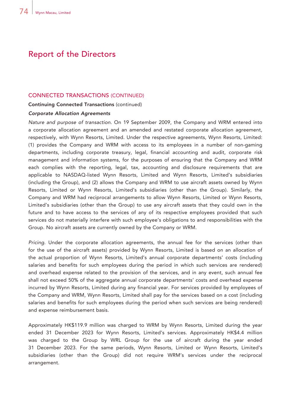 74 Wynn Macau, Limited Report of the Directors CONNECTED TRANSACTIONS (CONTINUED) Continuing Connected Transactions (continued) Corporate Allocation Agreements Nature and purpose of transaction. On 19 September 2009, the Company and WRM entered into a corporate allocation agreement and an amended and restated corporate allocation agreement, respectively, with Wynn Resorts, Limited. Under the respective agreements, Wynn Resorts, Limited: (1) provides the Company and WRM with access to its employees in a number of non-gaming departments, including corporate treasury, legal, financial accounting and audit, corporate risk management and information systems, for the purposes of ensuring that the Company and WRM each complies with the reporting, legal, tax, accounting and disclosure requirements that are applicable to NASDAQ-listed Wynn Resorts, Limited and Wynn Resorts, Limited’s subsidiaries (including the Group), and (2) allows the Company and WRM to use aircraft assets owned by Wynn Resorts, Limited or Wynn Resorts, Limited’s subsidiaries (other than the Group). Similarly, the Company and WRM had reciprocal arrangements to allow Wynn Resorts, Limited or Wynn Resorts, Limited’s subsidiaries (other than the Group) to use any aircraft assets that they could own in the future and to have access to the services of any of its respective employees provided that such services do not materially interfere with such employee’s obligations to and responsibilities with the Group. No aircraft assets are currently owned by the Company or WRM. Pricing. Under the corporate allocation agreements, the annual fee for the services (other than for the use of the aircraft assets) provided by Wynn Resorts, Limited is based on an allocation of the actual proportion of Wynn Resorts, Limited’s annual corporate departments’ costs (including salaries and benefits for such employees during the period in which such services are rendered) and overhead expense related to the provision of the services, and in any event, such annual fee shall not exceed 50% of the aggregate annual corporate departments’ costs and overhead expense incurred by Wynn Resorts, Limited during any financial year. For services provided by employees of the Company and WRM, Wynn Resorts, Limited shall pay for the services based on a cost (including salaries and benefits for such employees during the period when such services are being rendered) and expense reimbursement basis. Approximately HK$119.9 million was charged to WRM by Wynn Resorts, Limited during the year ended 31 December 2023 for Wynn Resorts, Limited’s services. Approximately HK$4.4 million was charged to the Group by WRL Group for the use of aircraft during the year ended 31 December 2023. For the same periods, Wynn Resorts, Limited or Wynn Resorts, Limited’s subsidiaries (other than the Group) did not require WRM’s services under the reciprocal arrangement.