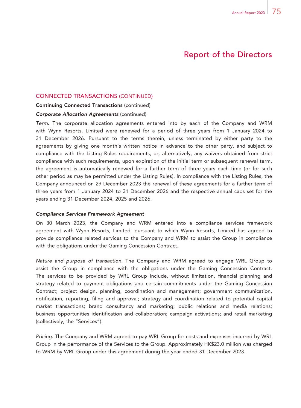 75Annual Report 2023 Report of the Directors CONNECTED TRANSACTIONS (CONTINUED) Continuing Connected Transactions (continued) Corporate Allocation Agreements (continued) Term. The corporate allocation agreements entered into by each of the Company and WRM with Wynn Resorts, Limited were renewed for a period of three years from 1 January 2024 to 31 December 2026. Pursuant to the terms therein, unless terminated by either party to the agreements by giving one month’s written notice in advance to the other party, and subject to compliance with the Listing Rules requirements, or, alternatively, any waivers obtained from strict compliance with such requirements, upon expiration of the initial term or subsequent renewal term, the agreement is automatically renewed for a further term of three years each time (or for such other period as may be permitted under the Listing Rules). In compliance with the Listing Rules, the Company announced on 29 December 2023 the renewal of these agreements for a further term of three years from 1 January 2024 to 31 December 2026 and the respective annual caps set for the years ending 31 December 2024, 2025 and 2026. Compliance Services Framework Agreement On 30 March 2023, the Company and WRM entered into a compliance services framework agreement with Wynn Resorts, Limited, pursuant to which Wynn Resorts, Limited has agreed to provide compliance related services to the Company and WRM to assist the Group in compliance with the obligations under the Gaming Concession Contract. Nature and purpose of transaction. The Company and WRM agreed to engage WRL Group to assist the Group in compliance with the obligations under the Gaming Concession Contract. The services to be provided by WRL Group include, without limitation, financial planning and strategy related to payment obligations and certain commitments under the Gaming Concession Contract; project design, planning, coordination and management; government communication, notification, reporting, filing and approval; strategy and coordination related to potential capital market transactions; brand consultancy and marketing; public relations and media relations; business opportunities identification and collaboration; campaign activations; and retail marketing (collectively, the “Services”). Pricing. The Company and WRM agreed to pay WRL Group for costs and expenses incurred by WRL Group in the performance of the Services to the Group. Approximately HK$23.0 million was charged to WRM by WRL Group under this agreement during the year ended 31 December 2023.
