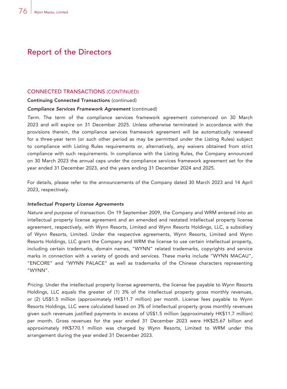 76 Wynn Macau, Limited Report of the Directors CONNECTED TRANSACTIONS (CONTINUED) Continuing Connected Transactions (continued) Compliance Services Framework Agreement (continued) Term. The term of the compliance services framework agreement commenced on 30 March 2023 and will expire on 31 December 2025. Unless otherwise terminated in accordance with the provisions therein, the compliance services framework agreement will be automatically renewed for a three-year term (or such other period as may be permitted under the Listing Rules) subject to compliance with Listing Rules requirements or, alternatively, any waivers obtained from strict compliance with such requirements. In compliance with the Listing Rules, the Company announced on 30 March 2023 the annual caps under the compliance services framework agreement set for the year ended 31 December 2023, and the years ending 31 December 2024 and 2025. For details, please refer to the announcements of the Company dated 30 March 2023 and 14 April 2023, respectively. Intellectual Property License Agreements Nature and purpose of transaction. On 19 September 2009, the Company and WRM entered into an intellectual property license agreement and an amended and restated intellectual property license agreement, respectively, with Wynn Resorts, Limited and Wynn Resorts Holdings, LLC, a subsidiary of Wynn Resorts, Limited. Under the respective agreements, Wynn Resorts, Limited and Wynn Resorts Holdings, LLC grant the Company and WRM the license to use certain intellectual property, including certain trademarks, domain names, “WYNN” related trademarks, copyrights and service marks in connection with a variety of goods and services. These marks include “WYNN MACAU”, “ENCORE” and “WYNN PALACE” as well as trademarks of the Chinese characters representing “WYNN”. Pricing. Under the intellectual property license agreements, the license fee payable to Wynn Resorts Holdings, LLC equals the greater of (1) 3% of the intellectual property gross monthly revenues, or (2) US$1.5 million (approximately HK$11.7 million) per month. License fees payable to Wynn Resorts Holdings, LLC were calculated based on 3% of intellectual property gross monthly revenues given such revenues justified payments in excess of US$1.5 million (approximately HK$11.7 million) per month. Gross revenues for the year ended 31 December 2023 were HK$25.67 billion and approximately HK$770.1 million was charged by Wynn Resorts, Limited to WRM under this arrangement during the year ended 31 December 2023.