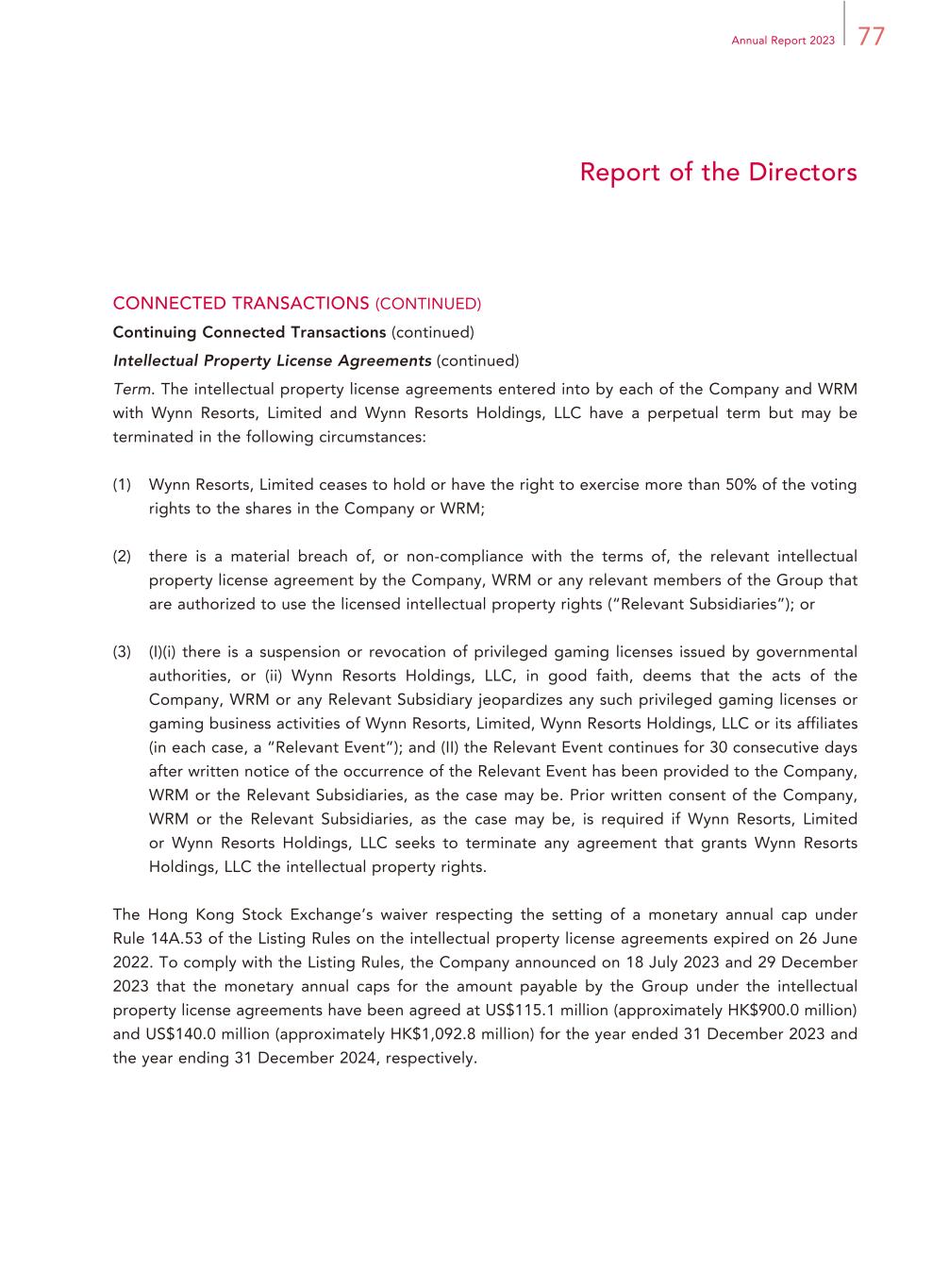 77Annual Report 2023 Report of the Directors CONNECTED TRANSACTIONS (CONTINUED) Continuing Connected Transactions (continued) Intellectual Property License Agreements (continued) Term. The intellectual property license agreements entered into by each of the Company and WRM with Wynn Resorts, Limited and Wynn Resorts Holdings, LLC have a perpetual term but may be terminated in the following circumstances: (1) Wynn Resorts, Limited ceases to hold or have the right to exercise more than 50% of the voting rights to the shares in the Company or WRM; (2) there is a material breach of, or non-compliance with the terms of, the relevant intellectual property license agreement by the Company, WRM or any relevant members of the Group that are authorized to use the licensed intellectual property rights (“Relevant Subsidiaries”); or (3) (I)(i) there is a suspension or revocation of privileged gaming licenses issued by governmental authorities, or (ii) Wynn Resorts Holdings, LLC, in good faith, deems that the acts of the Company, WRM or any Relevant Subsidiary jeopardizes any such privileged gaming licenses or gaming business activities of Wynn Resorts, Limited, Wynn Resorts Holdings, LLC or its affiliates (in each case, a “Relevant Event”); and (II) the Relevant Event continues for 30 consecutive days after written notice of the occurrence of the Relevant Event has been provided to the Company, WRM or the Relevant Subsidiaries, as the case may be. Prior written consent of the Company, WRM or the Relevant Subsidiaries, as the case may be, is required if Wynn Resorts, Limited or Wynn Resorts Holdings, LLC seeks to terminate any agreement that grants Wynn Resorts Holdings, LLC the intellectual property rights. The Hong Kong Stock Exchange’s waiver respecting the setting of a monetary annual cap under Rule 14A.53 of the Listing Rules on the intellectual property license agreements expired on 26 June 2022. To comply with the Listing Rules, the Company announced on 18 July 2023 and 29 December 2023 that the monetary annual caps for the amount payable by the Group under the intellectual property license agreements have been agreed at US$115.1 million (approximately HK$900.0 million) and US$140.0 million (approximately HK$1,092.8 million) for the year ended 31 December 2023 and the year ending 31 December 2024, respectively.