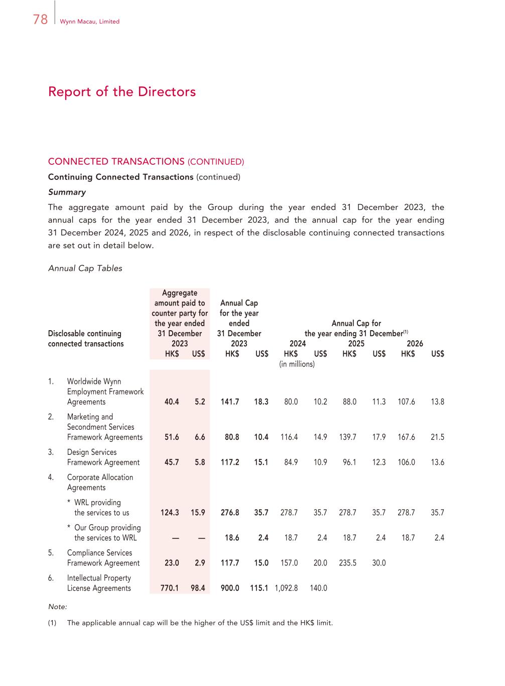 78 Wynn Macau, Limited Report of the Directors CONNECTED TRANSACTIONS (CONTINUED) Continuing Connected Transactions (continued) Summary The aggregate amount paid by the Group during the year ended 31 December 2023, the annual caps for the year ended 31 December 2023, and the annual cap for the year ending 31 December 2024, 2025 and 2026, in respect of the disclosable continuing connected transactions are set out in detail below. Annual Cap Tables Disclosable continuing connected transactions Aggregate amount paid to counter party for the year ended 31 December Annual Cap for the year ended 31 December Annual Cap for the year ending 31 December(1) 2023 2023 2024 2025 2026 HK$ US$ HK$ US$ HK$ US$ HK$ US$ HK$ US$ (in millions) 1. Worldwide Wynn Employment Framework Agreements 40.4 5.2 141.7 18.3 80.0 10.2 88.0 11.3 107.6 13.8 2. Marketing and Secondment Services Framework Agreements 51.6 6.6 80.8 10.4 116.4 14.9 139.7 17.9 167.6 21.5 3. Design Services Framework Agreement 45.7 5.8 117.2 15.1 84.9 10.9 96.1 12.3 106.0 13.6 4. Corporate Allocation Agreements * WRL providing the services to us 124.3 15.9 276.8 35.7 278.7 35.7 278.7 35.7 278.7 35.7 * Our Group providing the services to WRL — — 18.6 2.4 18.7 2.4 18.7 2.4 18.7 2.4 5. Compliance Services Framework Agreement 23.0 2.9 117.7 15.0 157.0 20.0 235.5 30.0 6. Intellectual Property License Agreements 770.1 98.4 900.0 115.1 1,092.8 140.0 Note: (1) The applicable annual cap will be the higher of the US$ limit and the HK$ limit.