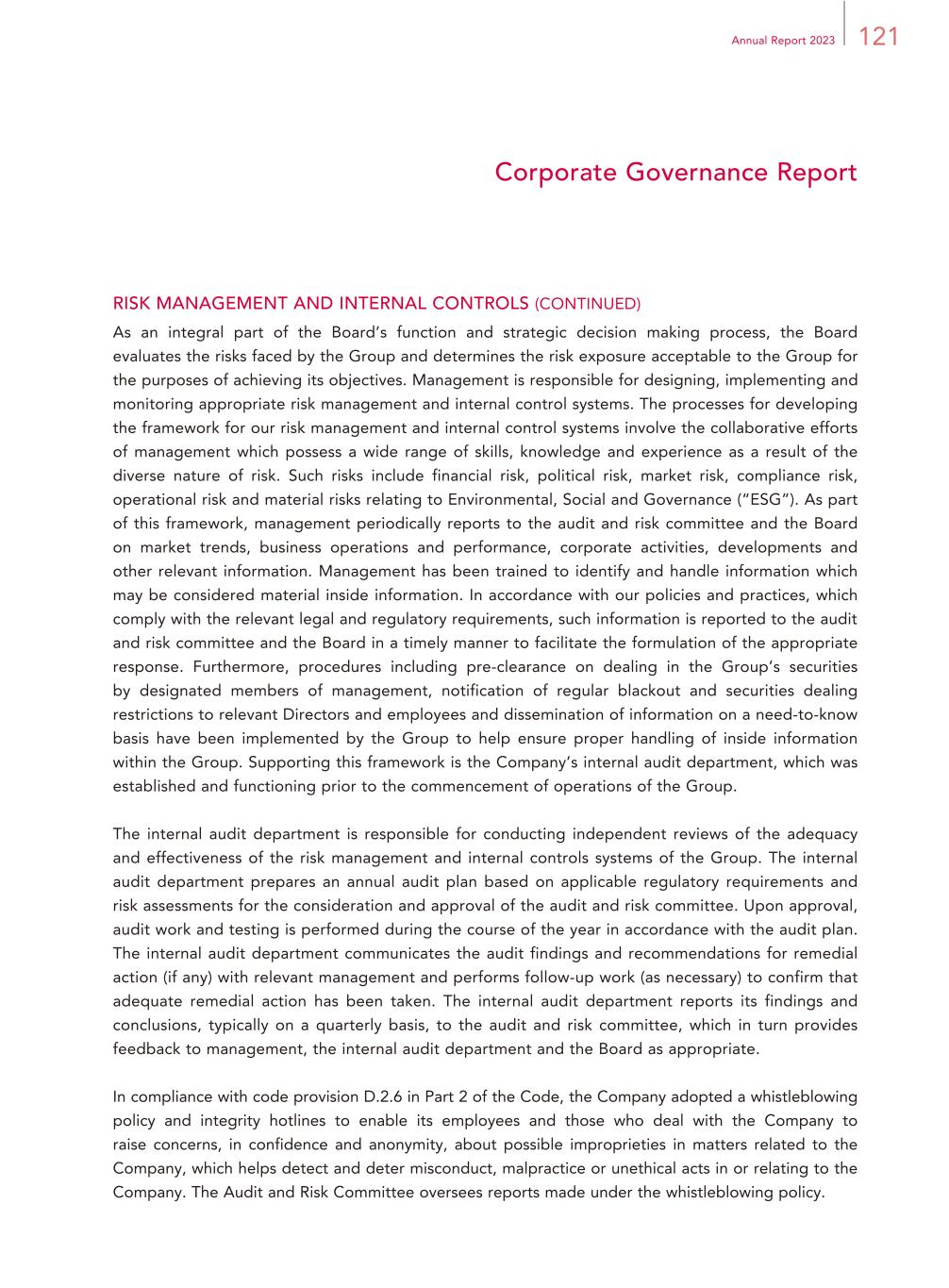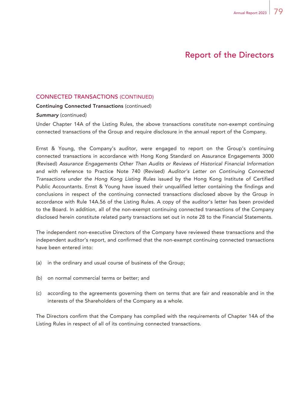 79Annual Report 2023 Report of the Directors CONNECTED TRANSACTIONS (CONTINUED) Continuing Connected Transactions (continued) Summary (continued) Under Chapter 14A of the Listing Rules, the above transactions constitute non-exempt continuing connected transactions of the Group and require disclosure in the annual report of the Company. Ernst & Young, the Company’s auditor, were engaged to report on the Group’s continuing connected transactions in accordance with Hong Kong Standard on Assurance Engagements 3000 (Revised) Assurance Engagements Other Than Audits or Reviews of Historical Financial Information and with reference to Practice Note 740 (Revised) Auditor’s Letter on Continuing Connected Transactions under the Hong Kong Listing Rules issued by the Hong Kong Institute of Certified Public Accountants. Ernst & Young have issued their unqualified letter containing the findings and conclusions in respect of the continuing connected transactions disclosed above by the Group in accordance with Rule 14A.56 of the Listing Rules. A copy of the auditor’s letter has been provided to the Board. In addition, all of the non-exempt continuing connected transactions of the Company disclosed herein constitute related party transactions set out in note 28 to the Financial Statements. The independent non-executive Directors of the Company have reviewed these transactions and the independent auditor’s report, and confirmed that the non-exempt continuing connected transactions have been entered into: (a) in the ordinary and usual course of business of the Group; (b) on normal commercial terms or better; and (c) according to the agreements governing them on terms that are fair and reasonable and in the interests of the Shareholders of the Company as a whole. The Directors confirm that the Company has complied with the requirements of Chapter 14A of the Listing Rules in respect of all of its continuing connected transactions.