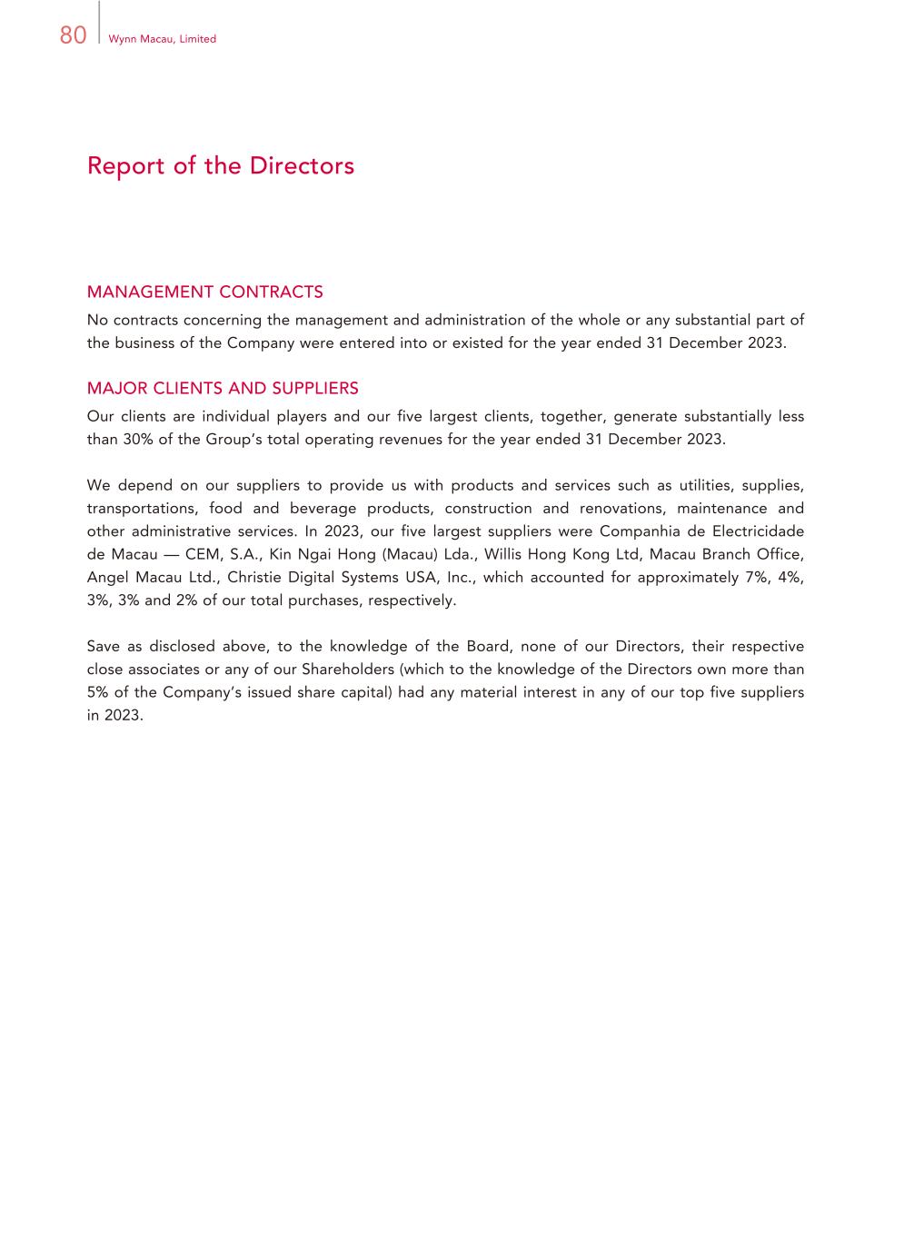 80 Wynn Macau, Limited Report of the Directors MANAGEMENT CONTRACTS No contracts concerning the management and administration of the whole or any substantial part of the business of the Company were entered into or existed for the year ended 31 December 2023. MAJOR CLIENTS AND SUPPLIERS Our clients are individual players and our five largest clients, together, generate substantially less than 30% of the Group’s total operating revenues for the year ended 31 December 2023. We depend on our suppliers to provide us with products and services such as utilities, supplies, transportations, food and beverage products, construction and renovations, maintenance and other administrative services. In 2023, our five largest suppliers were Companhia de Electricidade de Macau — CEM, S.A., Kin Ngai Hong (Macau) Lda., Willis Hong Kong Ltd, Macau Branch Office, Angel Macau Ltd., Christie Digital Systems USA, Inc., which accounted for approximately 7%, 4%, 3%, 3% and 2% of our total purchases, respectively. Save as disclosed above, to the knowledge of the Board, none of our Directors, their respective close associates or any of our Shareholders (which to the knowledge of the Directors own more than 5% of the Company’s issued share capital) had any material interest in any of our top five suppliers in 2023.