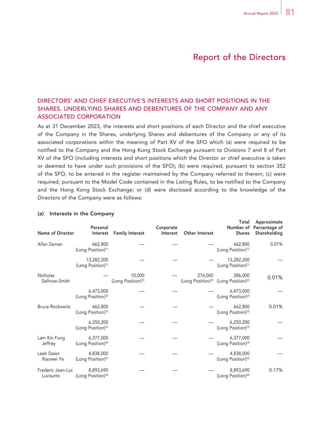 81Annual Report 2023 Report of the Directors DIRECTORS’ AND CHIEF EXECUTIVE’S INTERESTS AND SHORT POSITIONS IN THE SHARES, UNDERLYING SHARES AND DEBENTURES OF THE COMPANY AND ANY ASSOCIATED CORPORATION As at 31 December 2023, the interests and short positions of each Director and the chief executive of the Company in the Shares, underlying Shares and debentures of the Company or any of its associated corporations within the meaning of Part XV of the SFO which (a) were required to be notified to the Company and the Hong Kong Stock Exchange pursuant to Divisions 7 and 8 of Part XV of the SFO (including interests and short positions which the Director or chief executive is taken or deemed to have under such provisions of the SFO); (b) were required, pursuant to section 352 of the SFO, to be entered in the register maintained by the Company referred to therein; (c) were required, pursuant to the Model Code contained in the Listing Rules, to be notified to the Company and the Hong Kong Stock Exchange; or (d) were disclosed according to the knowledge of the Directors of the Company were as follows: (a) Interests in the Company Name of Director Personal Interest Family Interest Corporate Interest Other Interest Total Number of Shares Approximate Percentage of Shareholding Allan Zeman 662,800 (Long Position)(1) — — — 662,800 (Long Position)(1) 0.01% 13,282,200 (Long Position)(1) — — — 13,282,200 (Long Position)(1) — Nicholas Sallnow-Smith — 10,000 (Long Position)(2) — 276,000 (Long Position)(2) 286,000 (Long Position)(2) 0.01% 6,473,000 (Long Position)(2) — — — 6,473,000 (Long Position)(2) — Bruce Rockowitz 662,800 (Long Position)(3) — — — 662,800 (Long Position)(3) 0.01% 6,250,200 (Long Position)(3) — — — 6,250,200 (Long Position)(3) — Lam Kin Fung Jeffrey 6,377,000 (Long Position)(4) — — — 6,377,000 (Long Position)(4) — Leah Dawn Xiaowei Ye 4,838,000 (Long Position)(5) — — — 4,838,000 (Long Position)(5) — Frederic Jean-Luc Luvisutto 8,893,690 (Long Position)(6) — — — 8,893,690 (Long Position)(6) 0.17%