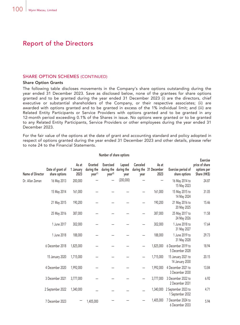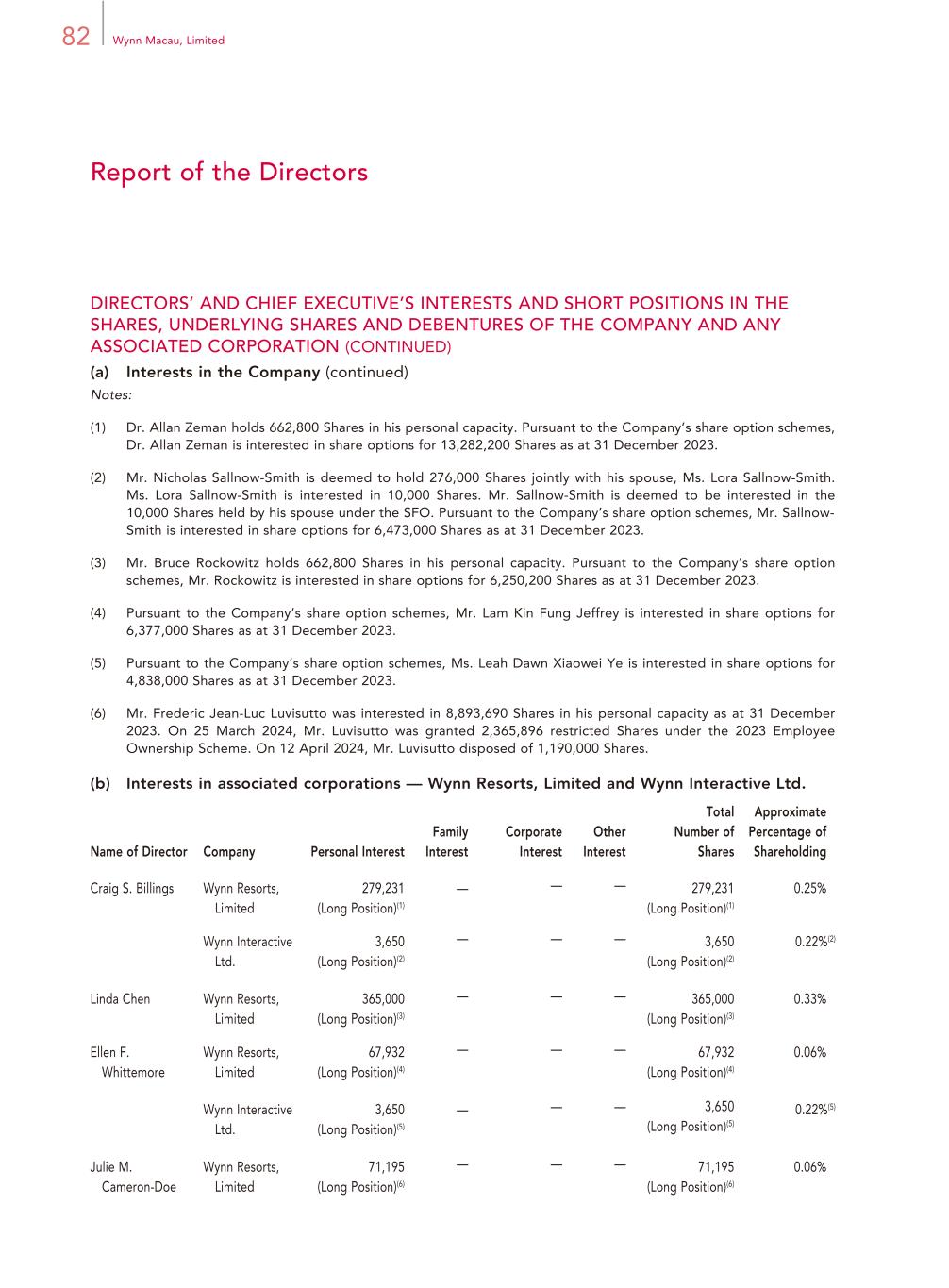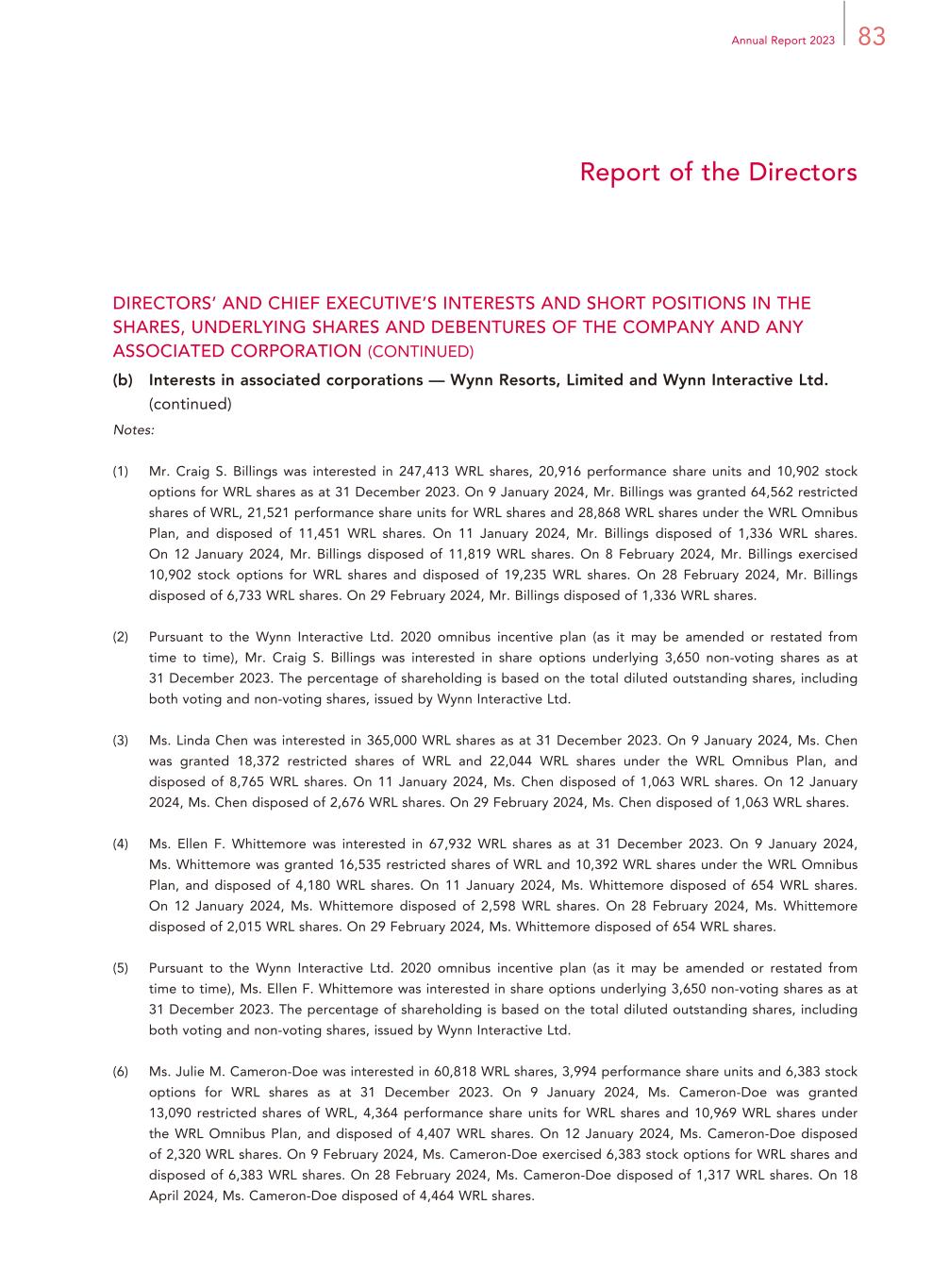 83Annual Report 2023 Report of the Directors DIRECTORS’ AND CHIEF EXECUTIVE’S INTERESTS AND SHORT POSITIONS IN THE SHARES, UNDERLYING SHARES AND DEBENTURES OF THE COMPANY AND ANY ASSOCIATED CORPORATION (CONTINUED) (b) Interests in associated corporations — Wynn Resorts, Limited and Wynn Interactive Ltd. (continued) Notes: (1) Mr. Craig S. Billings was interested in 247,413 WRL shares, 20,916 performance share units and 10,902 stock options for WRL shares as at 31 December 2023. On 9 January 2024, Mr. Billings was granted 64,562 restricted shares of WRL, 21,521 performance share units for WRL shares and 28,868 WRL shares under the WRL Omnibus Plan, and disposed of 11,451 WRL shares. On 11 January 2024, Mr. Billings disposed of 1,336 WRL shares. On 12 January 2024, Mr. Billings disposed of 11,819 WRL shares. On 8 February 2024, Mr. Billings exercised 10,902 stock options for WRL shares and disposed of 19,235 WRL shares. On 28 February 2024, Mr. Billings disposed of 6,733 WRL shares. On 29 February 2024, Mr. Billings disposed of 1,336 WRL shares. (2) Pursuant to the Wynn Interactive Ltd. 2020 omnibus incentive plan (as it may be amended or restated from time to time), Mr. Craig S. Billings was interested in share options underlying 3,650 non-voting shares as at 31 December 2023. The percentage of shareholding is based on the total diluted outstanding shares, including both voting and non-voting shares, issued by Wynn Interactive Ltd. (3) Ms. Linda Chen was interested in 365,000 WRL shares as at 31 December 2023. On 9 January 2024, Ms. Chen was granted 18,372 restricted shares of WRL and 22,044 WRL shares under the WRL Omnibus Plan, and disposed of 8,765 WRL shares. On 11 January 2024, Ms. Chen disposed of 1,063 WRL shares. On 12 January 2024, Ms. Chen disposed of 2,676 WRL shares. On 29 February 2024, Ms. Chen disposed of 1,063 WRL shares. (4) Ms. Ellen F. Whittemore was interested in 67,932 WRL shares as at 31 December 2023. On 9 January 2024, Ms. Whittemore was granted 16,535 restricted shares of WRL and 10,392 WRL shares under the WRL Omnibus Plan, and disposed of 4,180 WRL shares. On 11 January 2024, Ms. Whittemore disposed of 654 WRL shares. On 12 January 2024, Ms. Whittemore disposed of 2,598 WRL shares. On 28 February 2024, Ms. Whittemore disposed of 2,015 WRL shares. On 29 February 2024, Ms. Whittemore disposed of 654 WRL shares. (5) Pursuant to the Wynn Interactive Ltd. 2020 omnibus incentive plan (as it may be amended or restated from time to time), Ms. Ellen F. Whittemore was interested in share options underlying 3,650 non-voting shares as at 31 December 2023. The percentage of shareholding is based on the total diluted outstanding shares, including both voting and non-voting shares, issued by Wynn Interactive Ltd. (6) Ms. Julie M. Cameron-Doe was interested in 60,818 WRL shares, 3,994 performance share units and 6,383 stock options for WRL shares as at 31 December 2023. On 9 January 2024, Ms. Cameron-Doe was granted 13,090 restricted shares of WRL, 4,364 performance share units for WRL shares and 10,969 WRL shares under the WRL Omnibus Plan, and disposed of 4,407 WRL shares. On 12 January 2024, Ms. Cameron-Doe disposed of 2,320 WRL shares. On 9 February 2024, Ms. Cameron-Doe exercised 6,383 stock options for WRL shares and disposed of 6,383 WRL shares. On 28 February 2024, Ms. Cameron-Doe disposed of 1,317 WRL shares. On 18 April 2024, Ms. Cameron-Doe disposed of 4,464 WRL shares.