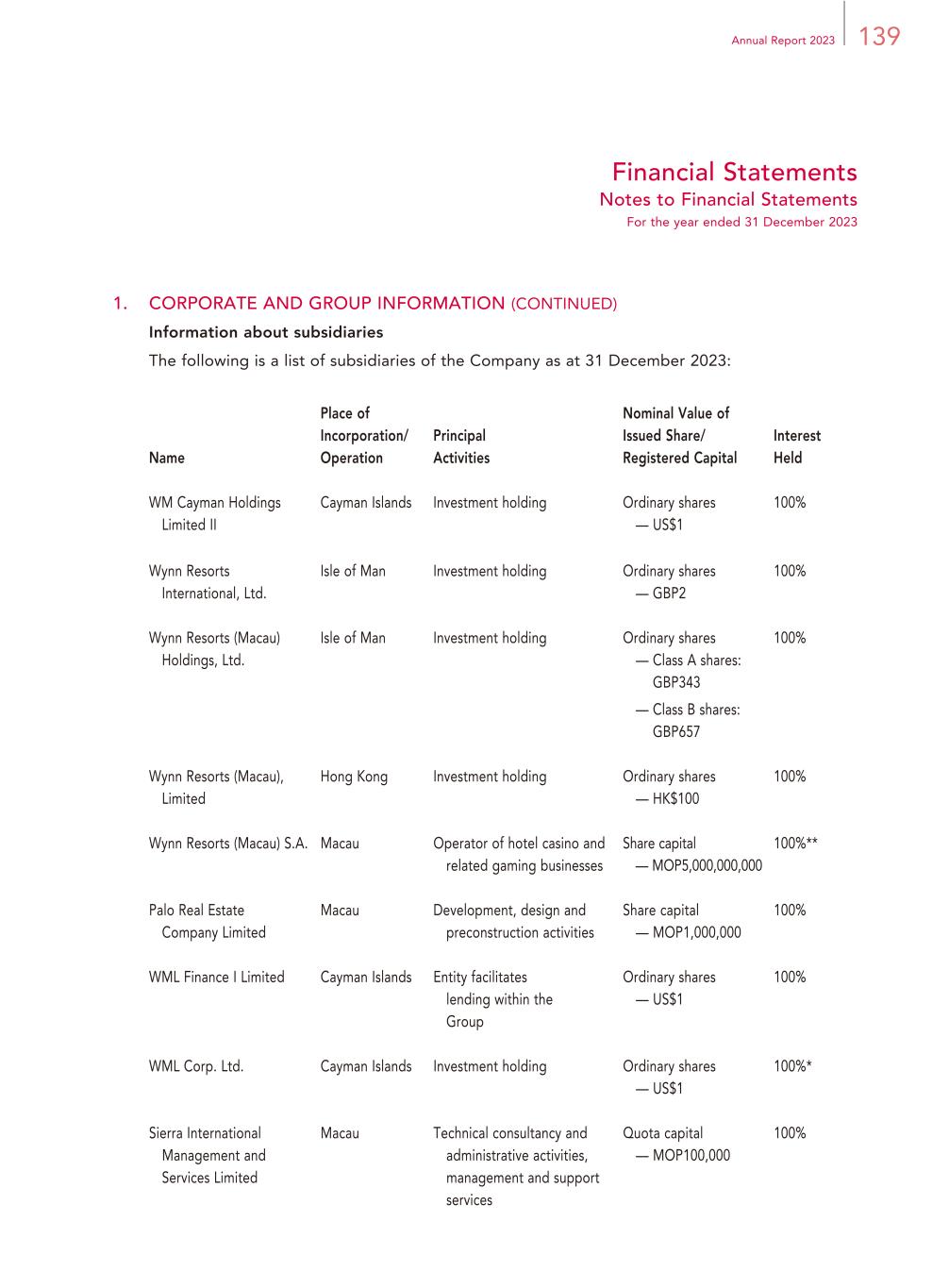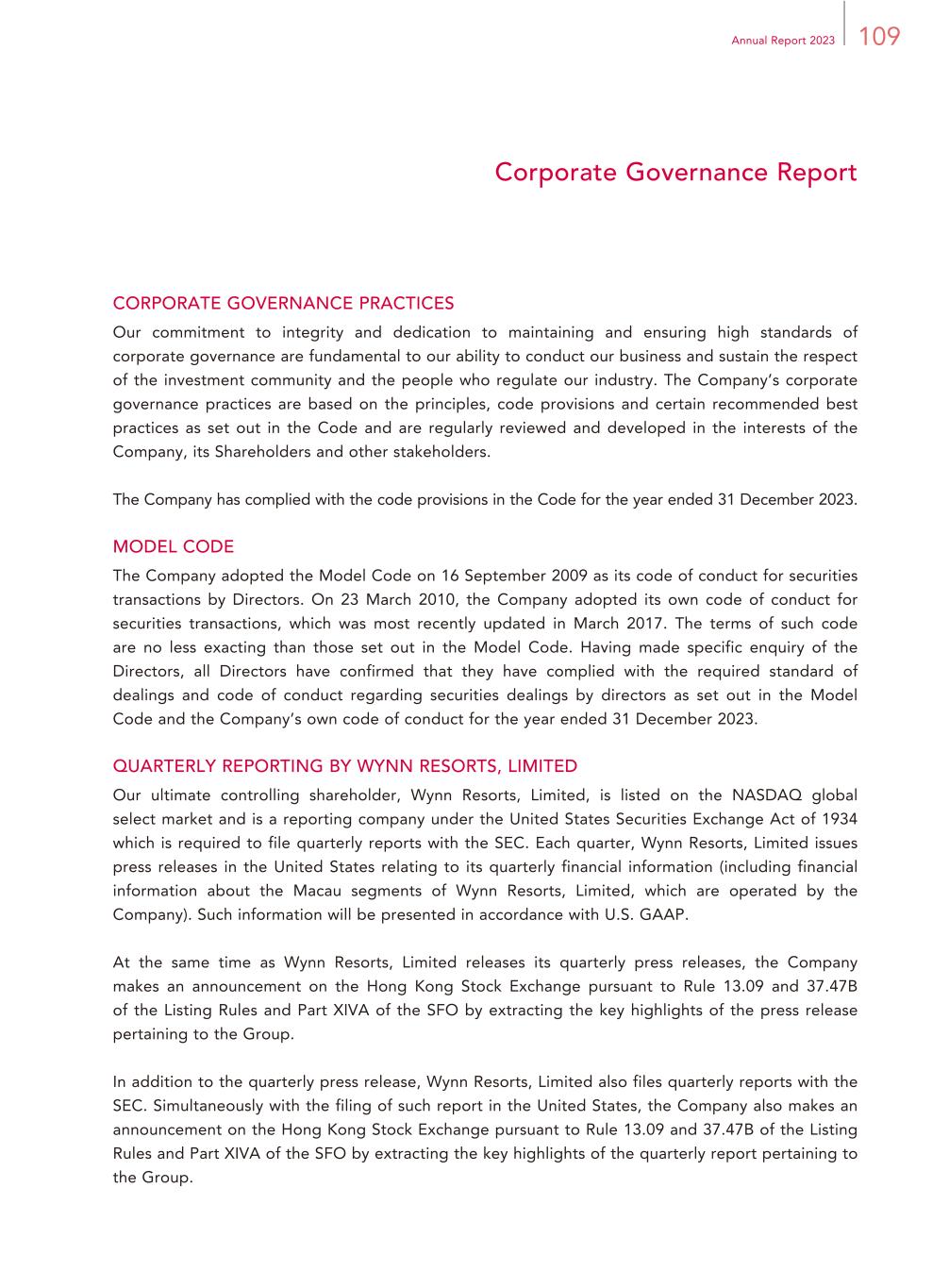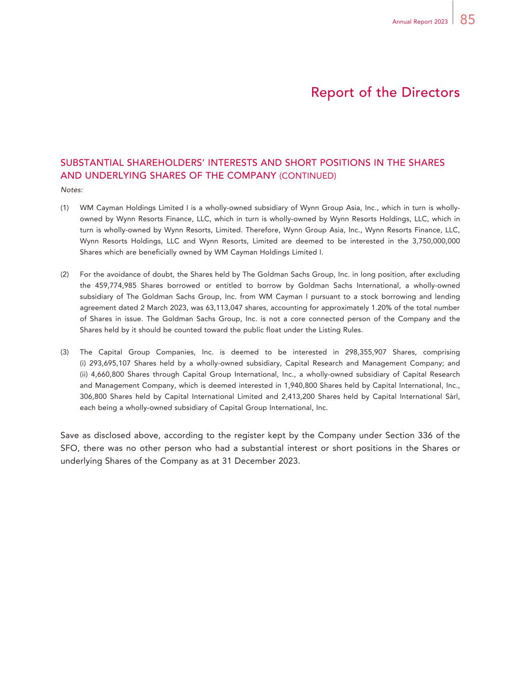 85Annual Report 2023 Report of the Directors SUBSTANTIAL SHAREHOLDERS’ INTERESTS AND SHORT POSITIONS IN THE SHARES AND UNDERLYING SHARES OF THE COMPANY (CONTINUED) Notes: (1) WM Cayman Holdings Limited I is a wholly-owned subsidiary of Wynn Group Asia, Inc., which in turn is wholly- owned by Wynn Resorts Finance, LLC, which in turn is wholly-owned by Wynn Resorts Holdings, LLC, which in turn is wholly-owned by Wynn Resorts, Limited. Therefore, Wynn Group Asia, Inc., Wynn Resorts Finance, LLC, Wynn Resorts Holdings, LLC and Wynn Resorts, Limited are deemed to be interested in the 3,750,000,000 Shares which are beneficially owned by WM Cayman Holdings Limited I. (2) For the avoidance of doubt, the Shares held by The Goldman Sachs Group, Inc. in long position, after excluding the 459,774,985 Shares borrowed or entitled to borrow by Goldman Sachs International, a wholly-owned subsidiary of The Goldman Sachs Group, Inc. from WM Cayman I pursuant to a stock borrowing and lending agreement dated 2 March 2023, was 63,113,047 shares, accounting for approximately 1.20% of the total number of Shares in issue. The Goldman Sachs Group, Inc. is not a core connected person of the Company and the Shares held by it should be counted toward the public float under the Listing Rules. (3) The Capital Group Companies, Inc. is deemed to be interested in 298,355,907 Shares, comprising (i) 293,695,107 Shares held by a wholly-owned subsidiary, Capital Research and Management Company; and (ii) 4,660,800 Shares through Capital Group International, Inc., a wholly-owned subsidiary of Capital Research and Management Company, which is deemed interested in 1,940,800 Shares held by Capital International, Inc., 306,800 Shares held by Capital International Limited and 2,413,200 Shares held by Capital International Sàrl, each being a wholly-owned subsidiary of Capital Group International, Inc. Save as disclosed above, according to the register kept by the Company under Section 336 of the SFO, there was no other person who had a substantial interest or short positions in the Shares or underlying Shares of the Company as at 31 December 2023.