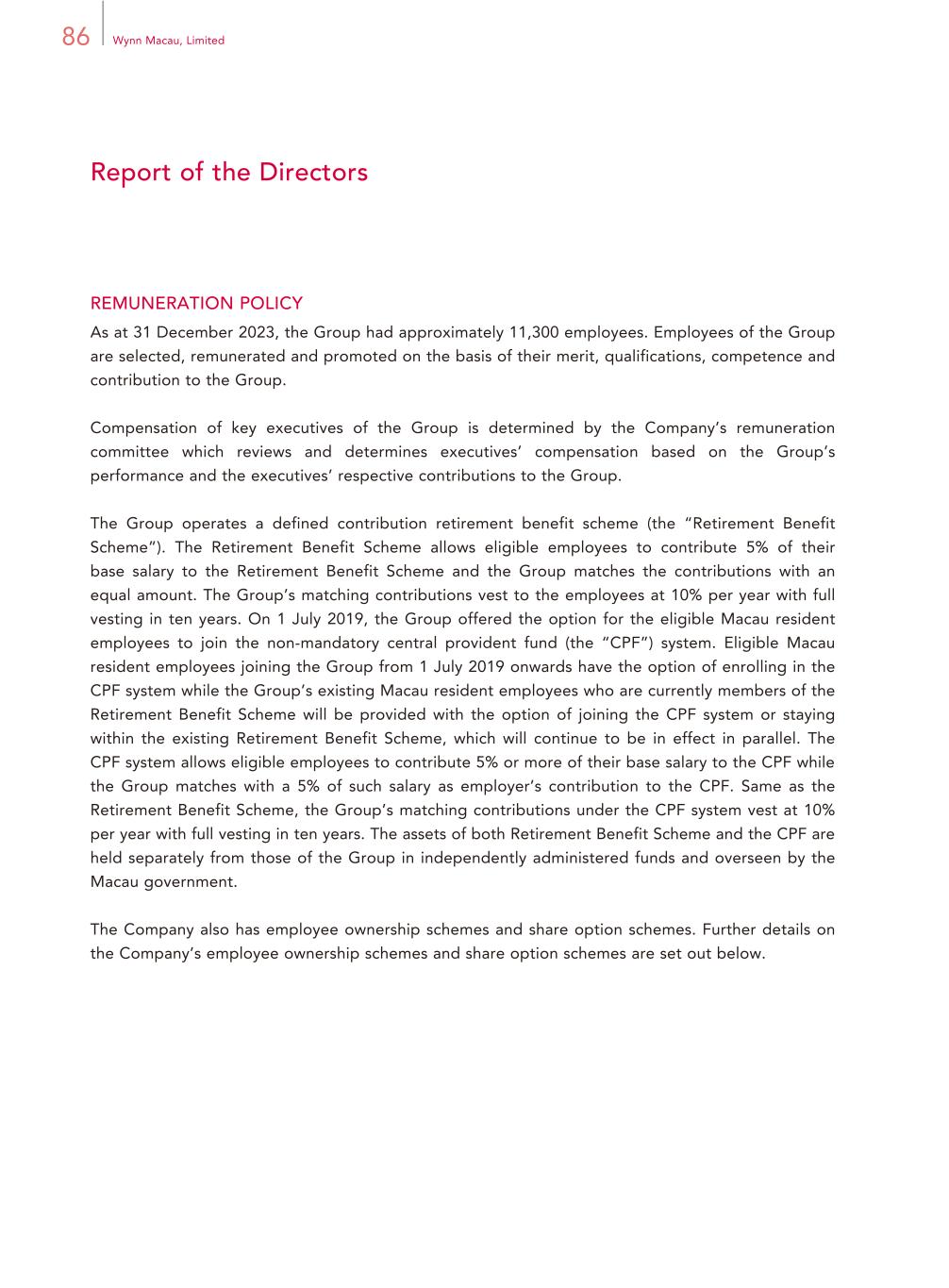86 Wynn Macau, Limited Report of the Directors REMUNERATION POLICY As at 31 December 2023, the Group had approximately 11,300 employees. Employees of the Group are selected, remunerated and promoted on the basis of their merit, qualifications, competence and contribution to the Group. Compensation of key executives of the Group is determined by the Company’s remuneration committee which reviews and determines executives’ compensation based on the Group’s performance and the executives’ respective contributions to the Group. The Group operates a defined contribution retirement benefit scheme (the “Retirement Benefit Scheme”). The Retirement Benefit Scheme allows eligible employees to contribute 5% of their base salary to the Retirement Benefit Scheme and the Group matches the contributions with an equal amount. The Group’s matching contributions vest to the employees at 10% per year with full vesting in ten years. On 1 July 2019, the Group offered the option for the eligible Macau resident employees to join the non-mandatory central provident fund (the “CPF”) system. Eligible Macau resident employees joining the Group from 1 July 2019 onwards have the option of enrolling in the CPF system while the Group’s existing Macau resident employees who are currently members of the Retirement Benefit Scheme will be provided with the option of joining the CPF system or staying within the existing Retirement Benefit Scheme, which will continue to be in effect in parallel. The CPF system allows eligible employees to contribute 5% or more of their base salary to the CPF while the Group matches with a 5% of such salary as employer’s contribution to the CPF. Same as the Retirement Benefit Scheme, the Group’s matching contributions under the CPF system vest at 10% per year with full vesting in ten years. The assets of both Retirement Benefit Scheme and the CPF are held separately from those of the Group in independently administered funds and overseen by the Macau government. The Company also has employee ownership schemes and share option schemes. Further details on the Company’s employee ownership schemes and share option schemes are set out below.