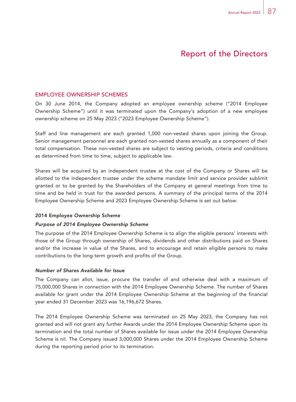 87Annual Report 2023 Report of the Directors EMPLOYEE OWNERSHIP SCHEMES On 30 June 2014, the Company adopted an employee ownership scheme (“2014 Employee Ownership Scheme”) until it was terminated upon the Company’s adoption of a new employee ownership scheme on 25 May 2023 (“2023 Employee Ownership Scheme”). Staff and line management are each granted 1,000 non-vested shares upon joining the Group. Senior management personnel are each granted non-vested shares annually as a component of their total compensation. These non-vested shares are subject to vesting periods, criteria and conditions as determined from time to time, subject to applicable law. Shares will be acquired by an independent trustee at the cost of the Company or Shares will be allotted to the independent trustee under the scheme mandate limit and service provider sublimit granted or to be granted by the Shareholders of the Company at general meetings from time to time and be held in trust for the awarded persons. A summary of the principal terms of the 2014 Employee Ownership Scheme and 2023 Employee Ownership Scheme is set out below: 2014 Employee Ownership Scheme Purpose of 2014 Employee Ownership Scheme The purpose of the 2014 Employee Ownership Scheme is to align the eligible persons’ interests with those of the Group through ownership of Shares, dividends and other distributions paid on Shares and/or the increase in value of the Shares, and to encourage and retain eligible persons to make contributions to the long-term growth and profits of the Group. Number of Shares Available for Issue The Company can allot, issue, procure the transfer of and otherwise deal with a maximum of 75,000,000 Shares in connection with the 2014 Employee Ownership Scheme. The number of Shares available for grant under the 2014 Employee Ownership Scheme at the beginning of the financial year ended 31 December 2023 was 16,196,672 Shares. The 2014 Employee Ownership Scheme was terminated on 25 May 2023, the Company has not granted and will not grant any further Awards under the 2014 Employee Ownership Scheme upon its termination and the total number of Shares available for issue under the 2014 Employee Ownership Scheme is nil. The Company issued 3,000,000 Shares under the 2014 Employee Ownership Scheme during the reporting period prior to its termination.