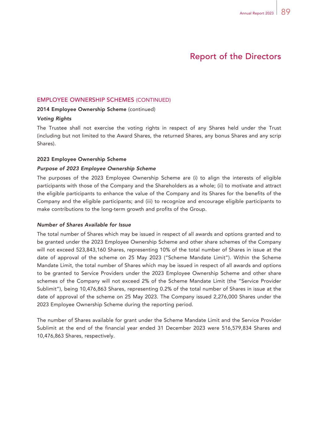 89Annual Report 2023 Report of the Directors EMPLOYEE OWNERSHIP SCHEMES (CONTINUED) 2014 Employee Ownership Scheme (continued) Voting Rights The Trustee shall not exercise the voting rights in respect of any Shares held under the Trust (including but not limited to the Award Shares, the returned Shares, any bonus Shares and any scrip Shares). 2023 Employee Ownership Scheme Purpose of 2023 Employee Ownership Scheme The purposes of the 2023 Employee Ownership Scheme are (i) to align the interests of eligible participants with those of the Company and the Shareholders as a whole; (ii) to motivate and attract the eligible participants to enhance the value of the Company and its Shares for the benefits of the Company and the eligible participants; and (iii) to recognize and encourage eligible participants to make contributions to the long-term growth and profits of the Group. Number of Shares Available for Issue The total number of Shares which may be issued in respect of all awards and options granted and to be granted under the 2023 Employee Ownership Scheme and other share schemes of the Company will not exceed 523,843,160 Shares, representing 10% of the total number of Shares in issue at the date of approval of the scheme on 25 May 2023 (“Scheme Mandate Limit”). Within the Scheme Mandate Limit, the total number of Shares which may be issued in respect of all awards and options to be granted to Service Providers under the 2023 Employee Ownership Scheme and other share schemes of the Company will not exceed 2% of the Scheme Mandate Limit (the “Service Provider Sublimit”), being 10,476,863 Shares, representing 0.2% of the total number of Shares in issue at the date of approval of the scheme on 25 May 2023. The Company issued 2,276,000 Shares under the 2023 Employee Ownership Scheme during the reporting period. The number of Shares available for grant under the Scheme Mandate Limit and the Service Provider Sublimit at the end of the financial year ended 31 December 2023 were 516,579,834 Shares and 10,476,863 Shares, respectively.