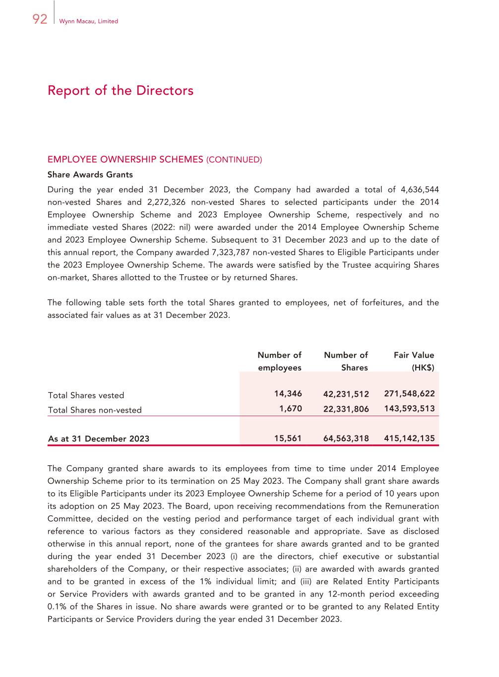 92 Wynn Macau, Limited Report of the Directors EMPLOYEE OWNERSHIP SCHEMES (CONTINUED) Share Awards Grants During the year ended 31 December 2023, the Company had awarded a total of 4,636,544 non-vested Shares and 2,272,326 non-vested Shares to selected participants under the 2014 Employee Ownership Scheme and 2023 Employee Ownership Scheme, respectively and no immediate vested Shares (2022: nil) were awarded under the 2014 Employee Ownership Scheme and 2023 Employee Ownership Scheme. Subsequent to 31 December 2023 and up to the date of this annual report, the Company awarded 7,323,787 non-vested Shares to Eligible Participants under the 2023 Employee Ownership Scheme. The awards were satisfied by the Trustee acquiring Shares on-market, Shares allotted to the Trustee or by returned Shares. The following table sets forth the total Shares granted to employees, net of forfeitures, and the associated fair values as at 31 December 2023. Number of employees Number of Shares Fair Value (HK$) Total Shares vested 14,346 42,231,512 271,548,622 Total Shares non-vested 1,670 22,331,806 143,593,513 As at 31 December 2023 15,561 64,563,318 415,142,135 The Company granted share awards to its employees from time to time under 2014 Employee Ownership Scheme prior to its termination on 25 May 2023. The Company shall grant share awards to its Eligible Participants under its 2023 Employee Ownership Scheme for a period of 10 years upon its adoption on 25 May 2023. The Board, upon receiving recommendations from the Remuneration Committee, decided on the vesting period and performance target of each individual grant with reference to various factors as they considered reasonable and appropriate. Save as disclosed otherwise in this annual report, none of the grantees for share awards granted and to be granted during the year ended 31 December 2023 (i) are the directors, chief executive or substantial shareholders of the Company, or their respective associates; (ii) are awarded with awards granted and to be granted in excess of the 1% individual limit; and (iii) are Related Entity Participants or Service Providers with awards granted and to be granted in any 12-month period exceeding 0.1% of the Shares in issue. No share awards were granted or to be granted to any Related Entity Participants or Service Providers during the year ended 31 December 2023.