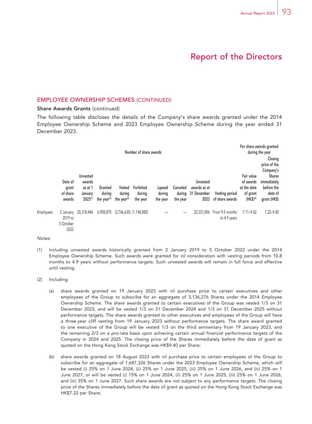 93Annual Report 2023 Report of the Directors EMPLOYEE OWNERSHIP SCHEMES (CONTINUED) Share Awards Grants (continued) The following table discloses the details of the Company’s share awards granted under the 2014 Employee Ownership Scheme and 2023 Employee Ownership Scheme during the year ended 31 December 2023. Number of share awards For share awards granted during the year Date of grant of share awards Unvested awards as at 1 January 2023(1) Granted during the year(2) Vested during the year(3) Forfeited during the year Lapsed during the year Canceled during the year Unvested awards as at 31 December 2023 Vesting period of share awards Fair value of awards at the date of grant (HK$)(4) Closing price of the Company’s Shares immediately before the date of grant (HK$) Employees 2 January 2019 to 5 October 2023 20,318,446 6,908,870 (3,746,630) (1,148,880) — — 22,331,806 From 9.5 months to 4.9 years 7.11–9.42 7.22–9.40 Notes: (1) Including unvested awards historically granted from 2 January 2019 to 5 October 2022 under the 2014 Employee Ownership Scheme. Such awards were granted for nil consideration with vesting periods from 10.8 months to 4.9 years without performance targets. Such unvested awards will remain in full force and effective until vesting. (2) Including (a) share awards granted on 19 January 2023 with nil purchase price to certain executives and other employees of the Group to subscribe for an aggregate of 3,136,276 Shares under the 2014 Employee Ownership Scheme. The share awards granted to certain executives of the Group was vested 1/3 on 31 December 2023, and will be vested 1/3 on 31 December 2024 and 1/3 on 31 December 2025 without performance targets. The share awards granted to other executives and employees of the Group will have a three-year cliff vesting from 19 January 2023 without performance targets. The share award granted to one executive of the Group will be vested 1/3 on the third anniversary from 19 January 2023, and the remaining 2/3 on a pro-rata basis upon achieving certain annual financial performance targets of the Company in 2024 and 2025. The closing price of the Shares immediately before the date of grant as quoted on the Hong Kong Stock Exchange was HK$9.40 per Share; (b) share awards granted on 18 August 2023 with nil purchase price to certain employees of the Group to subscribe for an aggregate of 1,687,326 Shares under the 2023 Employee Ownership Scheme, which will be vested (i) 25% on 1 June 2024, (ii) 25% on 1 June 2025, (iii) 25% on 1 June 2026, and (iv) 25% on 1 June 2027; or will be vested (i) 15% on 1 June 2024, (ii) 25% on 1 June 2025, (iii) 25% on 1 June 2026, and (iv) 35% on 1 June 2027. Such share awards are not subject to any performance targets. The closing price of the Shares immediately before the date of grant as quoted on the Hong Kong Stock Exchange was HK$7.22 per Share;