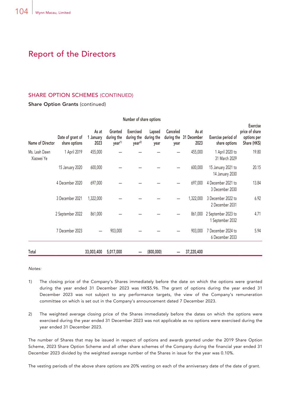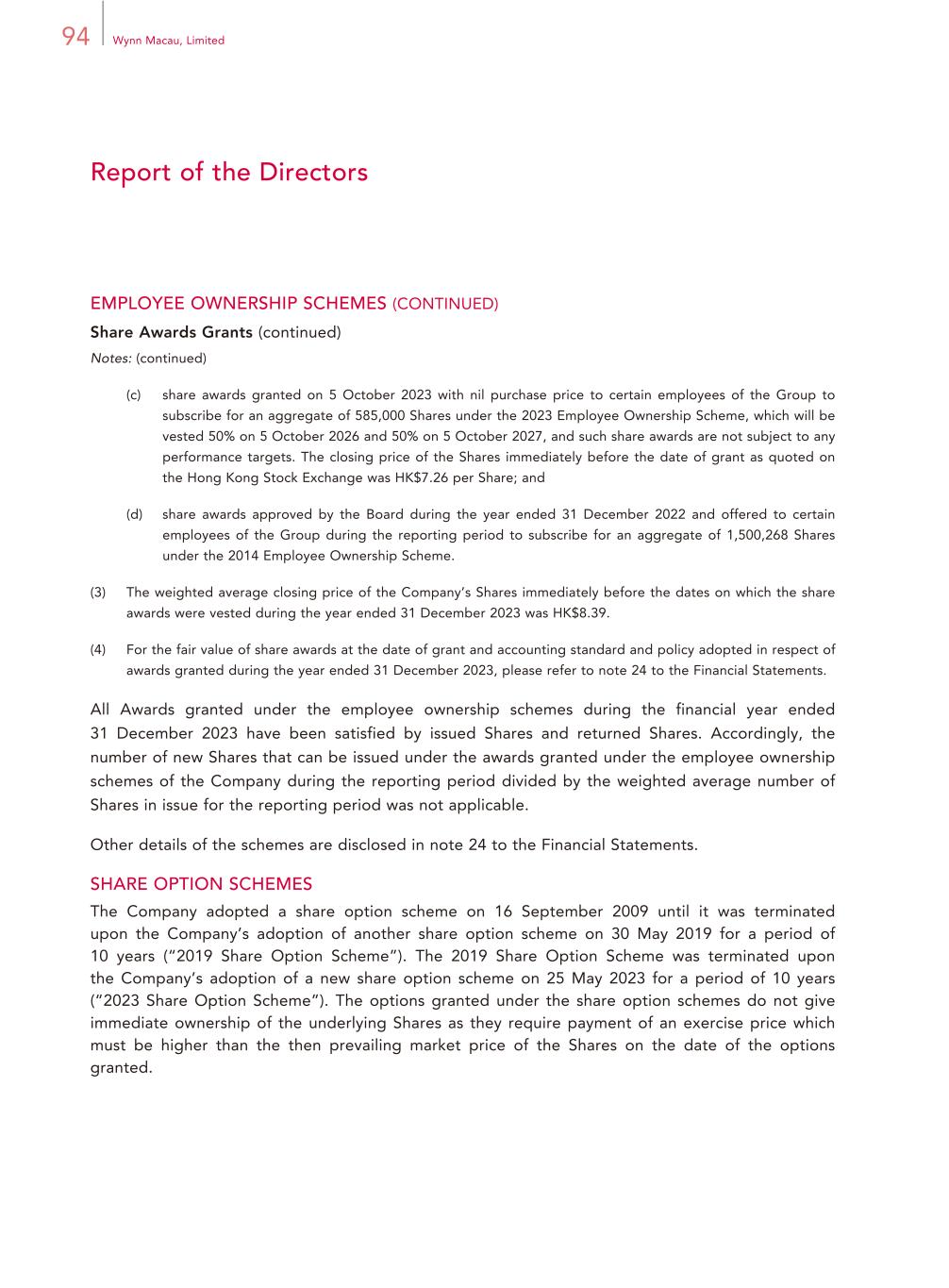 94 Wynn Macau, Limited Report of the Directors EMPLOYEE OWNERSHIP SCHEMES (CONTINUED) Share Awards Grants (continued) Notes: (continued) (c) share awards granted on 5 October 2023 with nil purchase price to certain employees of the Group to subscribe for an aggregate of 585,000 Shares under the 2023 Employee Ownership Scheme, which will be vested 50% on 5 October 2026 and 50% on 5 October 2027, and such share awards are not subject to any performance targets. The closing price of the Shares immediately before the date of grant as quoted on the Hong Kong Stock Exchange was HK$7.26 per Share; and (d) share awards approved by the Board during the year ended 31 December 2022 and offered to certain employees of the Group during the reporting period to subscribe for an aggregate of 1,500,268 Shares under the 2014 Employee Ownership Scheme. (3) The weighted average closing price of the Company’s Shares immediately before the dates on which the share awards were vested during the year ended 31 December 2023 was HK$8.39. (4) For the fair value of share awards at the date of grant and accounting standard and policy adopted in respect of awards granted during the year ended 31 December 2023, please refer to note 24 to the Financial Statements. All Awards granted under the employee ownership schemes during the financial year ended 31 December 2023 have been satisfied by issued Shares and returned Shares. Accordingly, the number of new Shares that can be issued under the awards granted under the employee ownership schemes of the Company during the reporting period divided by the weighted average number of Shares in issue for the reporting period was not applicable. Other details of the schemes are disclosed in note 24 to the Financial Statements. SHARE OPTION SCHEMES The Company adopted a share option scheme on 16 September 2009 until it was terminated upon the Company’s adoption of another share option scheme on 30 May 2019 for a period of 10 years (“2019 Share Option Scheme”). The 2019 Share Option Scheme was terminated upon the Company’s adoption of a new share option scheme on 25 May 2023 for a period of 10 years (“2023 Share Option Scheme”). The options granted under the share option schemes do not give immediate ownership of the underlying Shares as they require payment of an exercise price which must be higher than the then prevailing market price of the Shares on the date of the options granted.