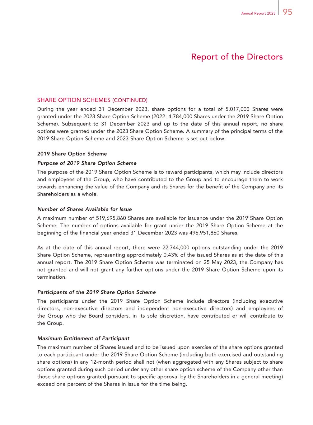 95Annual Report 2023 Report of the Directors SHARE OPTION SCHEMES (CONTINUED) During the year ended 31 December 2023, share options for a total of 5,017,000 Shares were granted under the 2023 Share Option Scheme (2022: 4,784,000 Shares under the 2019 Share Option Scheme). Subsequent to 31 December 2023 and up to the date of this annual report, no share options were granted under the 2023 Share Option Scheme. A summary of the principal terms of the 2019 Share Option Scheme and 2023 Share Option Scheme is set out below: 2019 Share Option Scheme Purpose of 2019 Share Option Scheme The purpose of the 2019 Share Option Scheme is to reward participants, which may include directors and employees of the Group, who have contributed to the Group and to encourage them to work towards enhancing the value of the Company and its Shares for the benefit of the Company and its Shareholders as a whole. Number of Shares Available for Issue A maximum number of 519,695,860 Shares are available for issuance under the 2019 Share Option Scheme. The number of options available for grant under the 2019 Share Option Scheme at the beginning of the financial year ended 31 December 2023 was 496,951,860 Shares. As at the date of this annual report, there were 22,744,000 options outstanding under the 2019 Share Option Scheme, representing approximately 0.43% of the issued Shares as at the date of this annual report. The 2019 Share Option Scheme was terminated on 25 May 2023, the Company has not granted and will not grant any further options under the 2019 Share Option Scheme upon its termination. Participants of the 2019 Share Option Scheme The participants under the 2019 Share Option Scheme include directors (including executive directors, non-executive directors and independent non-executive directors) and employees of the Group who the Board considers, in its sole discretion, have contributed or will contribute to the Group. Maximum Entitlement of Participant The maximum number of Shares issued and to be issued upon exercise of the share options granted to each participant under the 2019 Share Option Scheme (including both exercised and outstanding share options) in any 12-month period shall not (when aggregated with any Shares subject to share options granted during such period under any other share option scheme of the Company other than those share options granted pursuant to specific approval by the Shareholders in a general meeting) exceed one percent of the Shares in issue for the time being.
