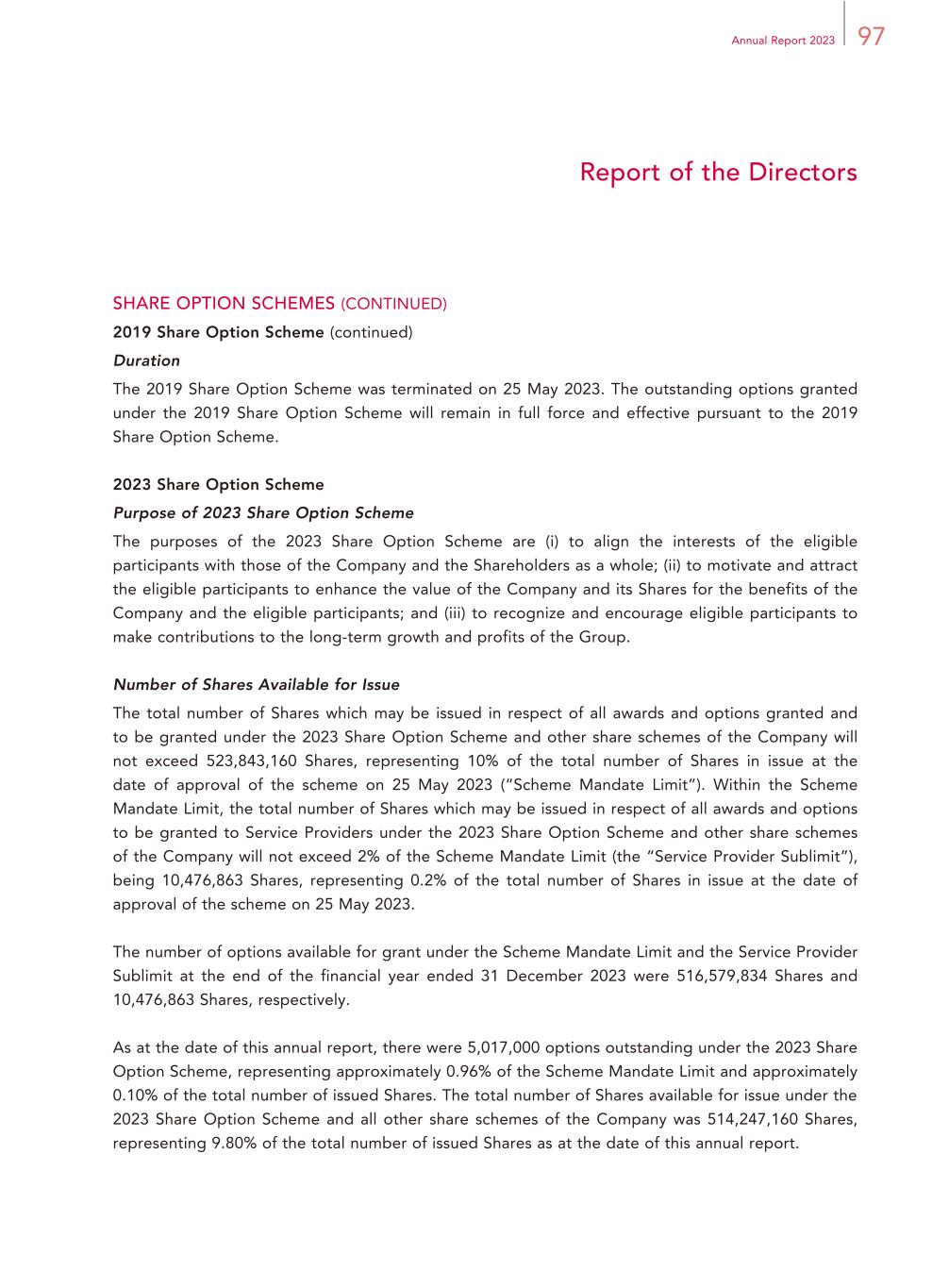 97Annual Report 2023 Report of the Directors SHARE OPTION SCHEMES (CONTINUED) 2019 Share Option Scheme (continued) Duration The 2019 Share Option Scheme was terminated on 25 May 2023. The outstanding options granted under the 2019 Share Option Scheme will remain in full force and effective pursuant to the 2019 Share Option Scheme. 2023 Share Option Scheme Purpose of 2023 Share Option Scheme The purposes of the 2023 Share Option Scheme are (i) to align the interests of the eligible participants with those of the Company and the Shareholders as a whole; (ii) to motivate and attract the eligible participants to enhance the value of the Company and its Shares for the benefits of the Company and the eligible participants; and (iii) to recognize and encourage eligible participants to make contributions to the long-term growth and profits of the Group. Number of Shares Available for Issue The total number of Shares which may be issued in respect of all awards and options granted and to be granted under the 2023 Share Option Scheme and other share schemes of the Company will not exceed 523,843,160 Shares, representing 10% of the total number of Shares in issue at the date of approval of the scheme on 25 May 2023 (“Scheme Mandate Limit”). Within the Scheme Mandate Limit, the total number of Shares which may be issued in respect of all awards and options to be granted to Service Providers under the 2023 Share Option Scheme and other share schemes of the Company will not exceed 2% of the Scheme Mandate Limit (the “Service Provider Sublimit”), being 10,476,863 Shares, representing 0.2% of the total number of Shares in issue at the date of approval of the scheme on 25 May 2023. The number of options available for grant under the Scheme Mandate Limit and the Service Provider Sublimit at the end of the financial year ended 31 December 2023 were 516,579,834 Shares and 10,476,863 Shares, respectively. As at the date of this annual report, there were 5,017,000 options outstanding under the 2023 Share Option Scheme, representing approximately 0.96% of the Scheme Mandate Limit and approximately 0.10% of the total number of issued Shares. The total number of Shares available for issue under the 2023 Share Option Scheme and all other share schemes of the Company was 514,247,160 Shares, representing 9.80% of the total number of issued Shares as at the date of this annual report.
