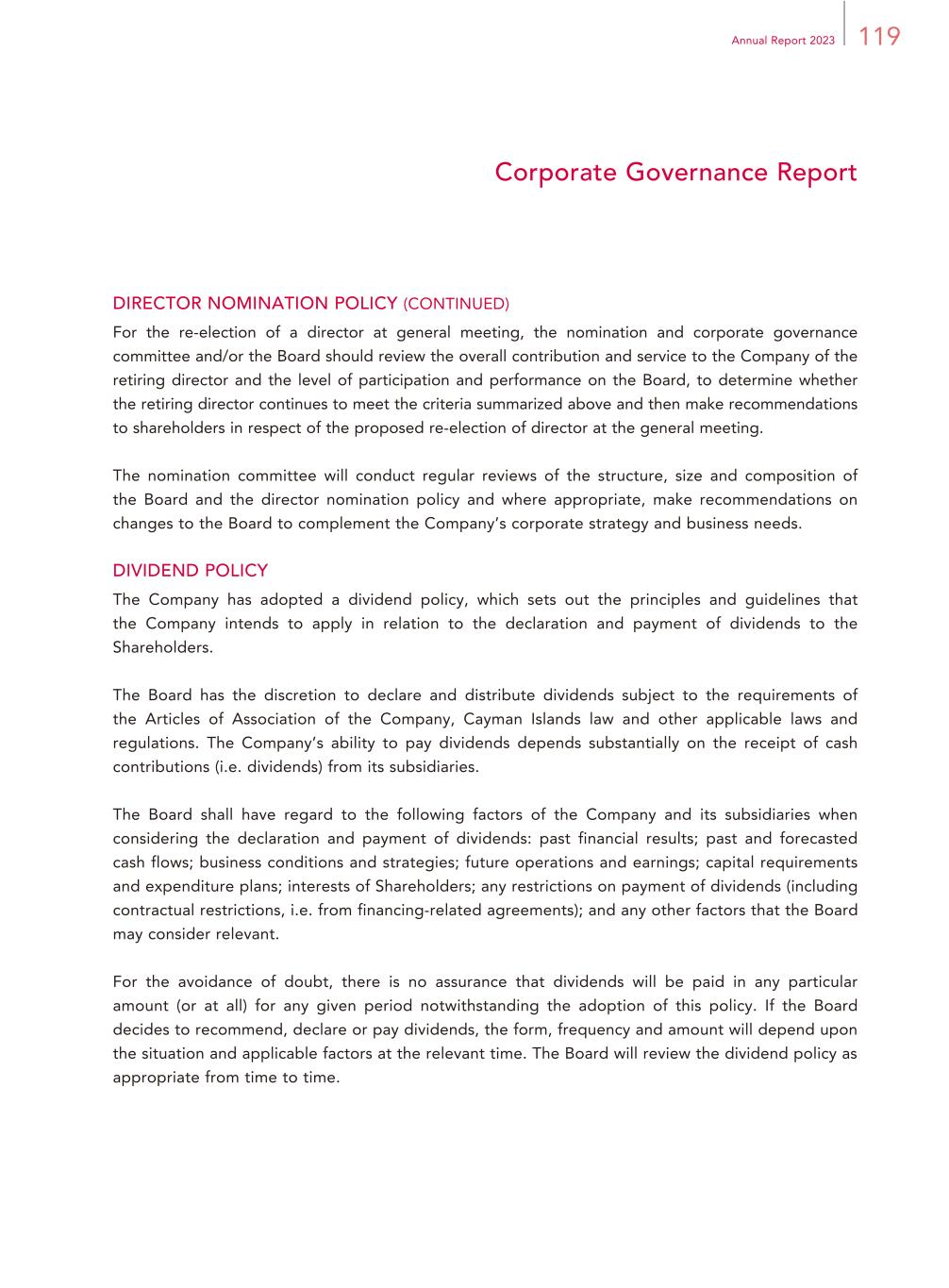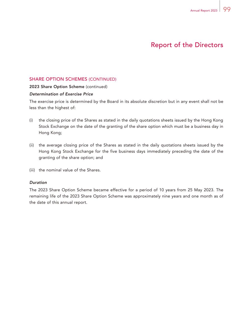 99Annual Report 2023 Report of the Directors SHARE OPTION SCHEMES (CONTINUED) 2023 Share Option Scheme (continued) Determination of Exercise Price The exercise price is determined by the Board in its absolute discretion but in any event shall not be less than the highest of: (i) the closing price of the Shares as stated in the daily quotations sheets issued by the Hong Kong Stock Exchange on the date of the granting of the share option which must be a business day in Hong Kong; (ii) the average closing price of the Shares as stated in the daily quotations sheets issued by the Hong Kong Stock Exchange for the five business days immediately preceding the date of the granting of the share option; and (iii) the nominal value of the Shares. Duration The 2023 Share Option Scheme became effective for a period of 10 years from 25 May 2023. The remaining life of the 2023 Share Option Scheme was approximately nine years and one month as of the date of this annual report.