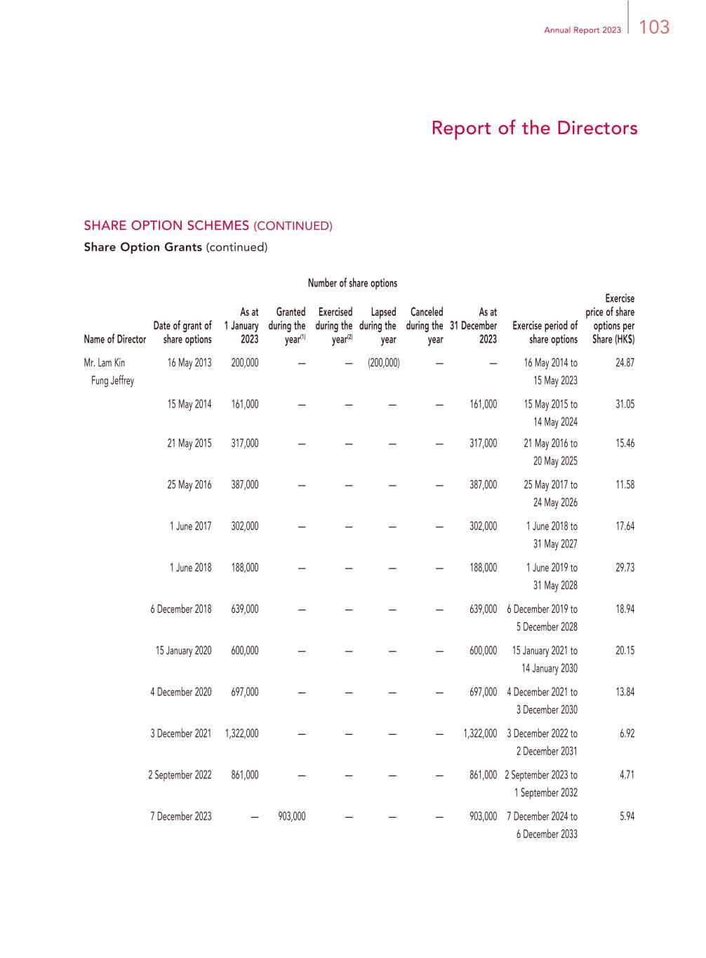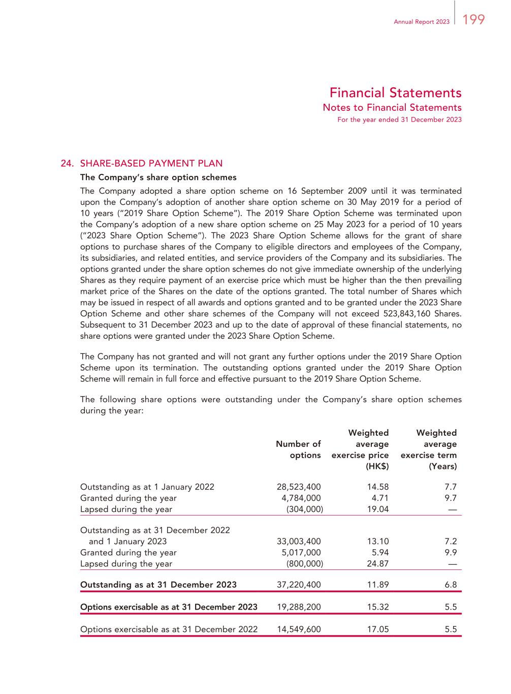 199Annual Report 2023 Financial Statements Notes to Financial Statements For the year ended 31 December 2023 24. SHARE-BASED PAYMENT PLAN The Company’s share option schemes The Company adopted a share option scheme on 16 September 2009 until it was terminated upon the Company’s adoption of another share option scheme on 30 May 2019 for a period of 10 years (“2019 Share Option Scheme”). The 2019 Share Option Scheme was terminated upon the Company’s adoption of a new share option scheme on 25 May 2023 for a period of 10 years (“2023 Share Option Scheme”). The 2023 Share Option Scheme allows for the grant of share options to purchase shares of the Company to eligible directors and employees of the Company, its subsidiaries, and related entities, and service providers of the Company and its subsidiaries. The options granted under the share option schemes do not give immediate ownership of the underlying Shares as they require payment of an exercise price which must be higher than the then prevailing market price of the Shares on the date of the options granted. The total number of Shares which may be issued in respect of all awards and options granted and to be granted under the 2023 Share Option Scheme and other share schemes of the Company will not exceed 523,843,160 Shares. Subsequent to 31 December 2023 and up to the date of approval of these financial statements, no share options were granted under the 2023 Share Option Scheme. The Company has not granted and will not grant any further options under the 2019 Share Option Scheme upon its termination. The outstanding options granted under the 2019 Share Option Scheme will remain in full force and effective pursuant to the 2019 Share Option Scheme. The following share options were outstanding under the Company’s share option schemes during the year: Number of options Weighted average exercise price Weighted average exercise term (HK$) (Years) Outstanding as at 1 January 2022 28,523,400 14.58 7.7 Granted during the year 4,784,000 4.71 9.7 Lapsed during the year (304,000) 19.04 — Outstanding as at 31 December 2022 and 1 January 2023 33,003,400 13.10 7.2 Granted during the year 5,017,000 5.94 9.9 Lapsed during the year (800,000) 24.87 — Outstanding as at 31 December 2023 37,220,400 11.89 6.8 Options exercisable as at 31 December 2023 19,288,200 15.32 5.5 Options exercisable as at 31 December 2022 14,549,600 17.05 5.5