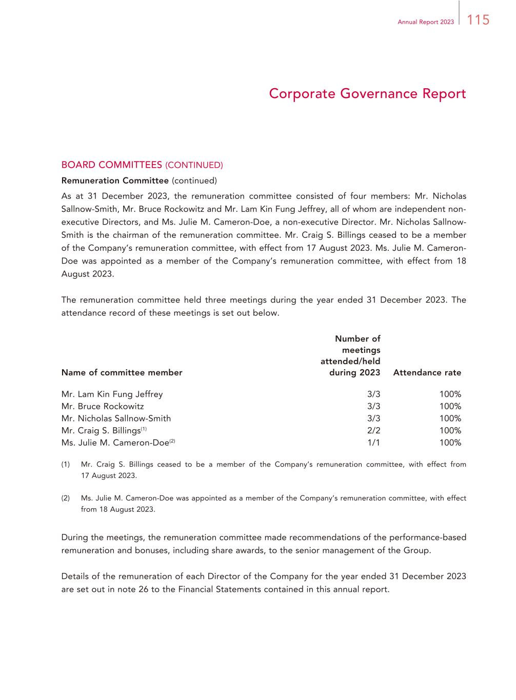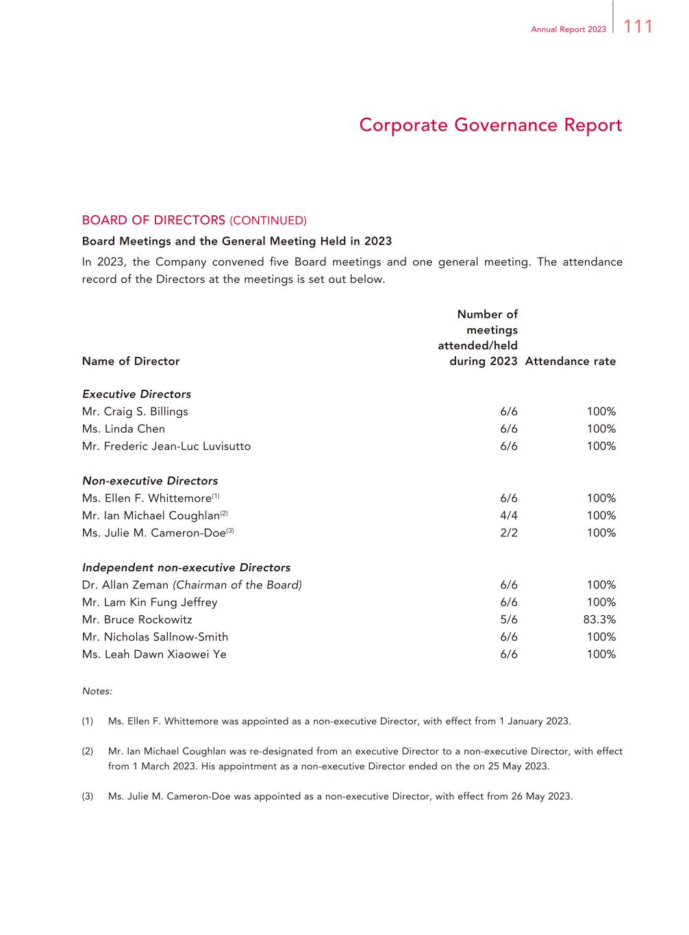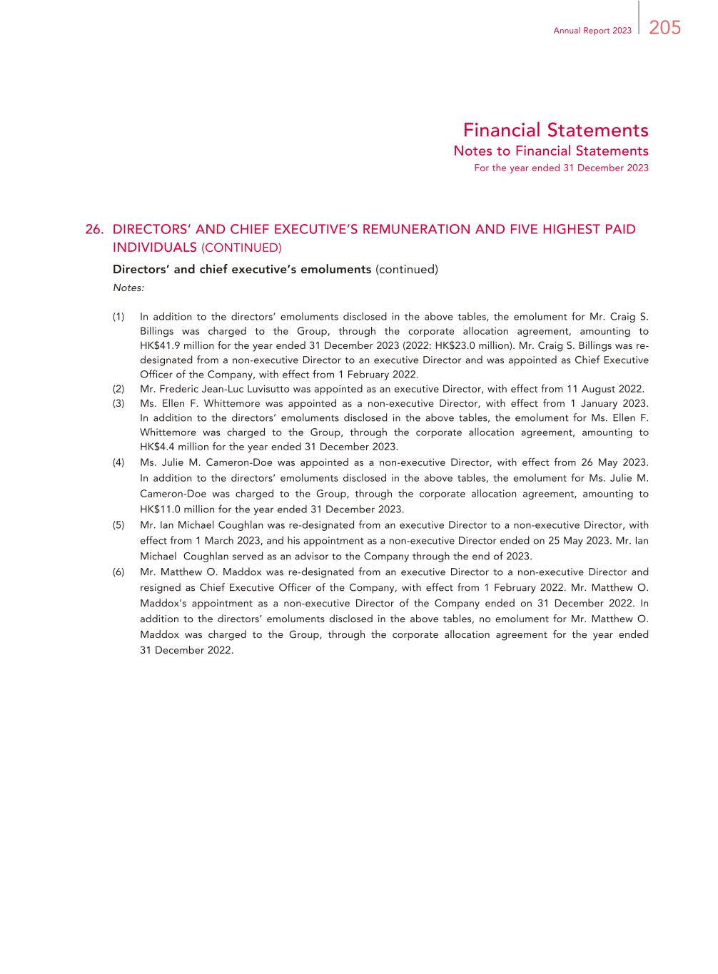 205Annual Report 2023 Financial Statements Notes to Financial Statements For the year ended 31 December 2023 26. DIRECTORS’ AND CHIEF EXECUTIVE’S REMUNERATION AND FIVE HIGHEST PAID INDIVIDUALS (CONTINUED) Directors’ and chief executive’s emoluments (continued) Notes: (1) In addition to the directors’ emoluments disclosed in the above tables, the emolument for Mr. Craig S. Billings was charged to the Group, through the corporate allocation agreement, amounting to HK$41.9 million for the year ended 31 December 2023 (2022: HK$23.0 million). Mr. Craig S. Billings was re- designated from a non-executive Director to an executive Director and was appointed as Chief Executive Officer of the Company, with effect from 1 February 2022. (2) Mr. Frederic Jean-Luc Luvisutto was appointed as an executive Director, with effect from 11 August 2022. (3) Ms. Ellen F. Whittemore was appointed as a non-executive Director, with effect from 1 January 2023. In addition to the directors’ emoluments disclosed in the above tables, the emolument for Ms. Ellen F. Whittemore was charged to the Group, through the corporate allocation agreement, amounting to HK$4.4 million for the year ended 31 December 2023. (4) Ms. Julie M. Cameron-Doe was appointed as a non-executive Director, with effect from 26 May 2023. In addition to the directors’ emoluments disclosed in the above tables, the emolument for Ms. Julie M. Cameron-Doe was charged to the Group, through the corporate allocation agreement, amounting to HK$11.0 million for the year ended 31 December 2023. (5) Mr. Ian Michael Coughlan was re-designated from an executive Director to a non-executive Director, with effect from 1 March 2023, and his appointment as a non-executive Director ended on 25 May 2023. Mr. Ian Michael Coughlan served as an advisor to the Company through the end of 2023. (6) Mr. Matthew O. Maddox was re-designated from an executive Director to a non-executive Director and resigned as Chief Executive Officer of the Company, with effect from 1 February 2022. Mr. Matthew O. Maddox’s appointment as a non-executive Director of the Company ended on 31 December 2022. In addition to the directors’ emoluments disclosed in the above tables, no emolument for Mr. Matthew O. Maddox was charged to the Group, through the corporate allocation agreement for the year ended 31 December 2022.