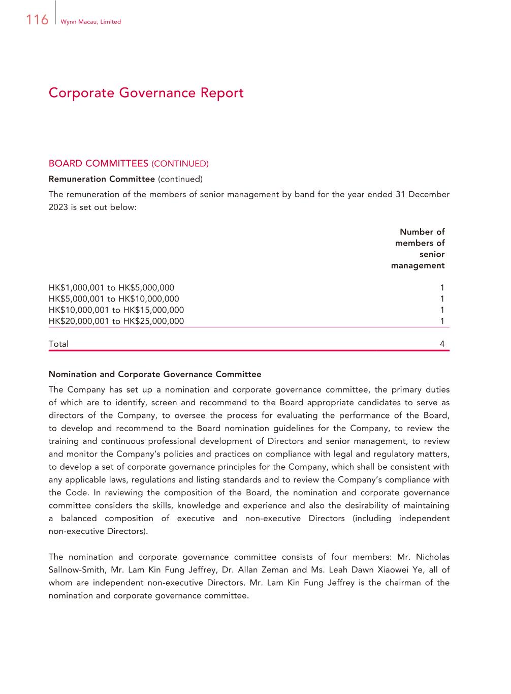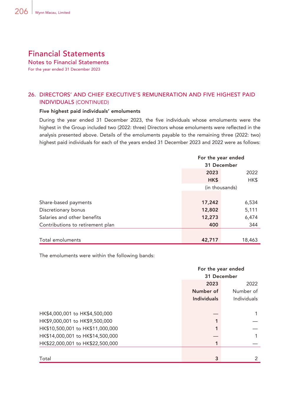 206 Wynn Macau, Limited Financial Statements Notes to Financial Statements For the year ended 31 December 2023 26. DIRECTORS’ AND CHIEF EXECUTIVE’S REMUNERATION AND FIVE HIGHEST PAID INDIVIDUALS (CONTINUED) Five highest paid individuals’ emoluments During the year ended 31 December 2023, the five individuals whose emoluments were the highest in the Group included two (2022: three) Directors whose emoluments were reflected in the analysis presented above. Details of the emoluments payable to the remaining three (2022: two) highest paid individuals for each of the years ended 31 December 2023 and 2022 were as follows: For the year ended 31 December 2023 2022 HK$ HK$ (in thousands) Share-based payments 17,242 6,534 Discretionary bonus 12,802 5,111 Salaries and other benefits 12,273 6,474 Contributions to retirement plan 400 344 Total emoluments 42,717 18,463 The emoluments were within the following bands: For the year ended 31 December 2023 2022 Number of Individuals Number of Individuals HK$4,000,001 to HK$4,500,000 — 1 HK$9,000,001 to HK$9,500,000 1 — HK$10,500,001 to HK$11,000,000 1 — HK$14,000,001 to HK$14,500,000 — 1 HK$22,000,001 to HK$22,500,000 1 — Total 3 2